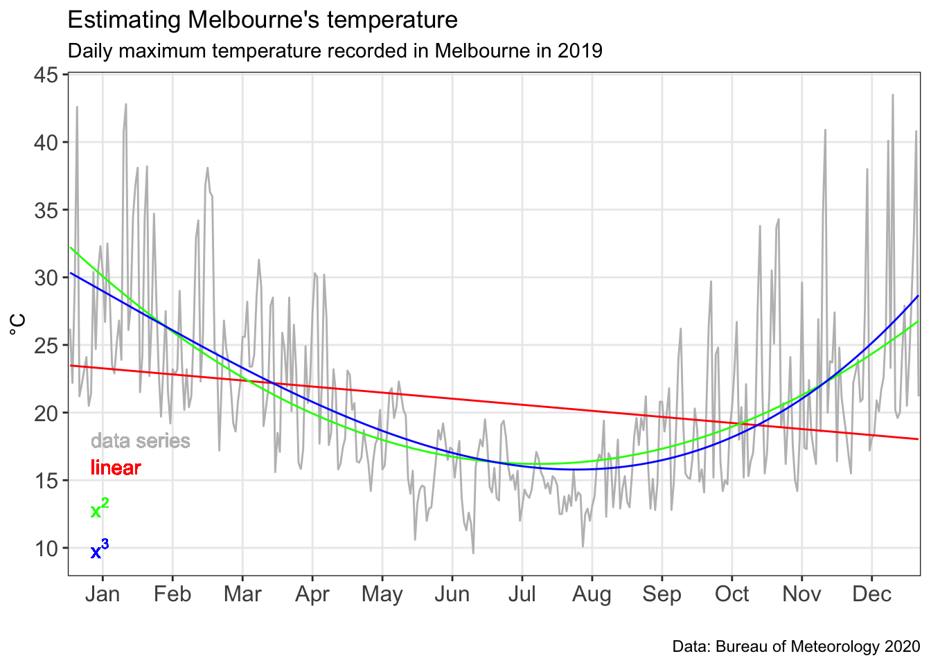 However we can expect that temperature follows a non-linear pattern throughout the year (in Australia it is hot in January-March, cold in June-August, then starts to warm up again). A linear model (e.g. a straight line) will be a very bad model for temperature — we need to introduce polynomials.
