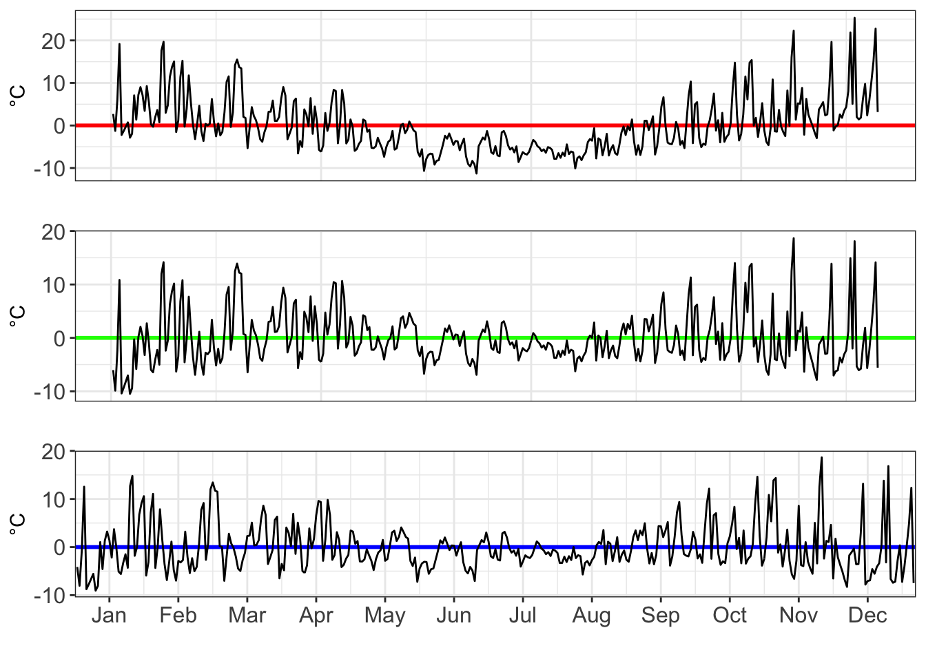 We start by looking whether a simple linear regression of solar exposure seems to be correlated with temperature. In R, we can use the linear model (lm) function.