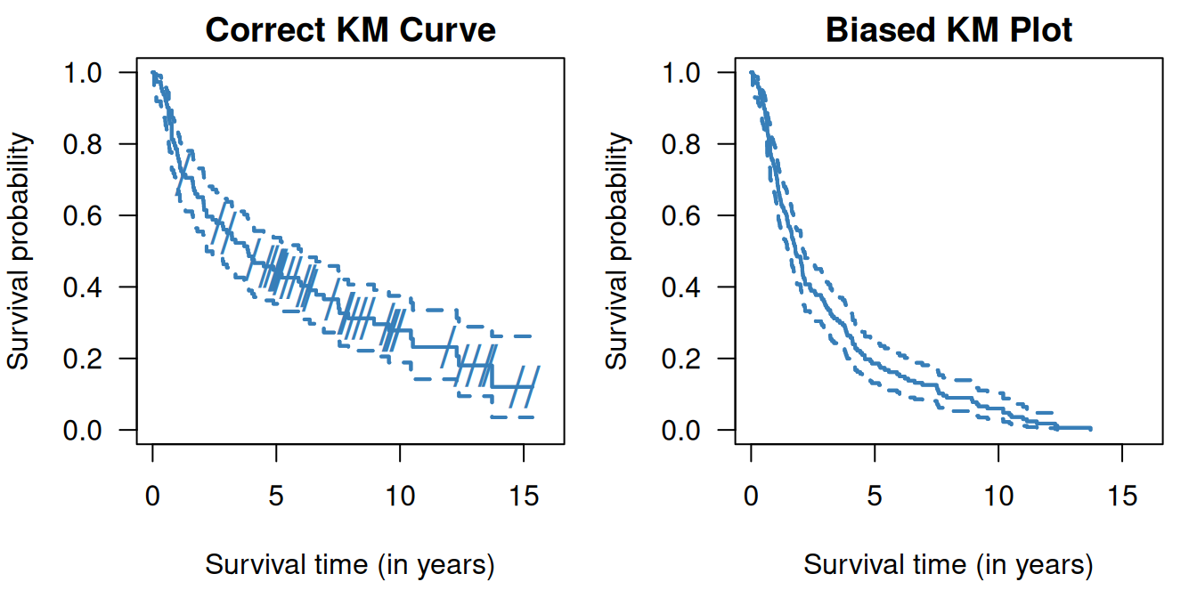 It is important to be careful with censored data. Censored observations cannot be simply ignored, i.e. excluded, and they cannot be treated as non-censored. Doing so would lead to biased estimation of the survival function as illustrated in Figure 9.5. Excluding censored observations means losing data on patients without events, so will underestimate the survival curve. Treating them as non-censored, i.e. as death events, also leads to underestimation of the survival curve.