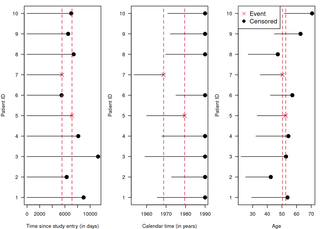 The results of a survival analysis depend upon the choice of time scale: time since study entry (i.e. randomisation in RCTs), calendar time, or age. For example, consider the following dataset: