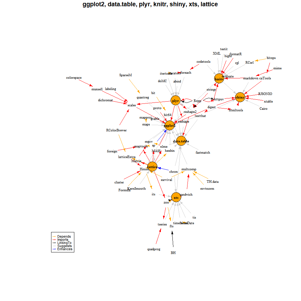 Since some of you mentioned other R packages for SNA (such as network), I want to take this opportunity to mention that there is a “universe” of R packages, the dependencies among which can be visualized as a giant graph (see this page). Among these packages, there are many packages developed for SNA. Different packages use different names for the same measure. For instance, the network package computes a network’s density using the network.density function; in igraph, edge_density is used to compute network density.