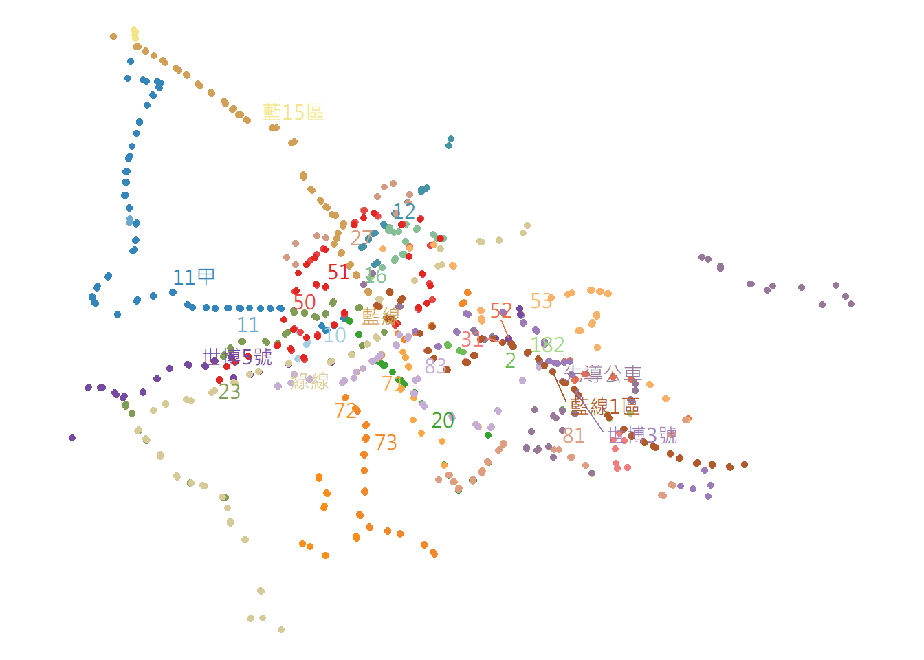 geom_sf_text_repel(data=Hsinchu_bus_station_agg, aes(label=RouteName, color=RouteName))