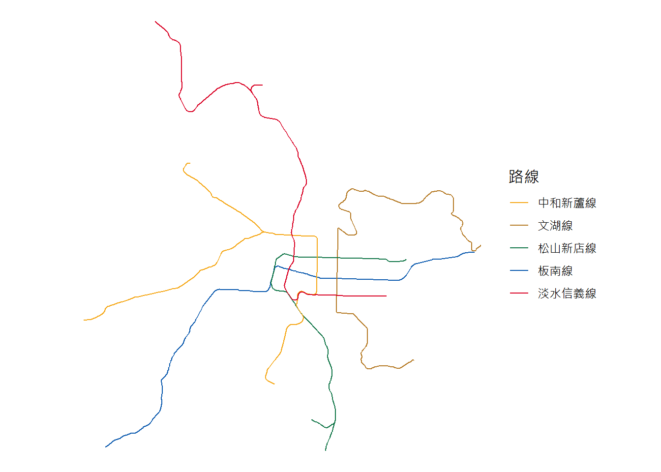 "中和新蘆線"="#f5a818", "文湖線"="#b57a25", "環狀線"="#fedb00"), name="路線")