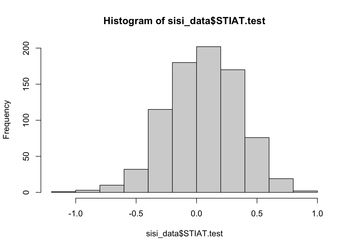 Using STIAT.test we can easily reproduce the graph from Figure 3 in the paper. Figure 3 is simply a histogram representing the distribution of this variable. Recall that positive scores indicate more favourable attitudes toward Sisi.