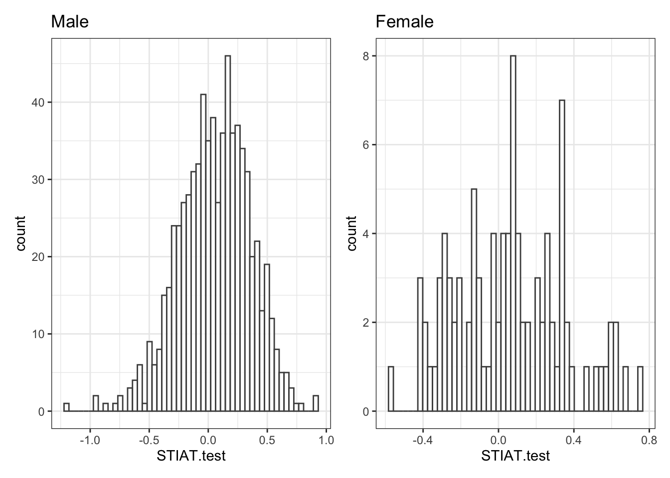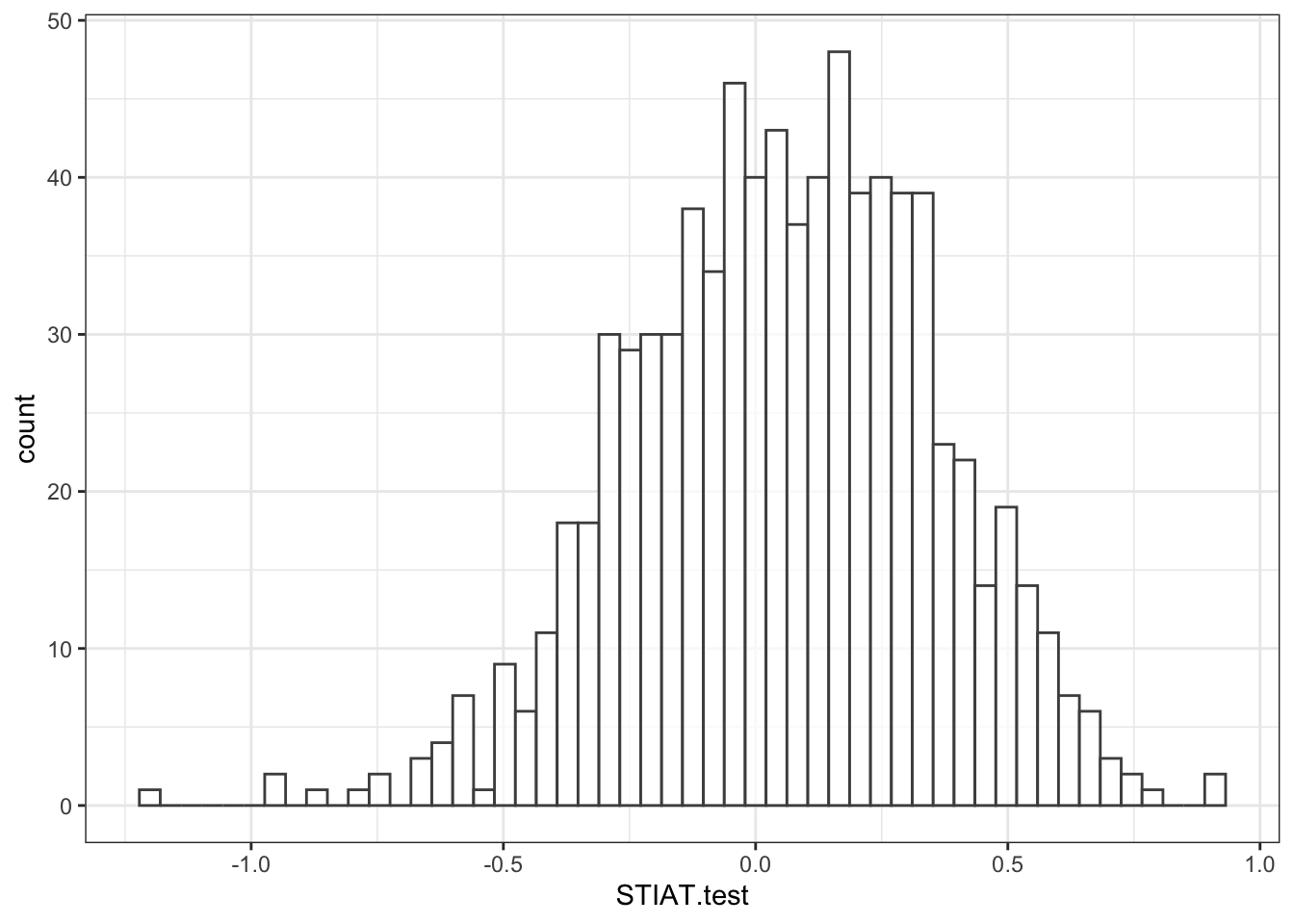 Let’s walk through this code step by step to better understand what ggplot2 is doing here. ggplot commands basically just tell R first what dataframe we’re using; i.e., ggplot(data = sisi_data, and after the comma we have a section where we specify our “aesthetic mappings” (or aes). In other words, this is where we tell R what we want on the x- and y-axis. Given that this is a histogram, we don’t have to specify the y-axis because we know that this will simply be a frequency mapping of whatever the x-axis variable is (a histogram is simply a graph of relative frequencies of the x-axis variable over the range of its observed values). We specify on the x- (horizontal) axis, then, STIAT.test, which is the variable measuring implicit attitudes toward Sisi. We then specify what type of graph we want. Here, we select geom_histogram as we want a histogram of the frequencies of each “bin” of this variable. We specify how many of these breaks we want with the argument bins=52. This simply means breaks should run from -1.3 to 1.3 with .05 increments. Why have I chosen this? Well, since our variable runs from -1.3 to 1.3, the range of the variable is 2.6 (1.3+1.3). If we divide 2.6 by .05, we get a nice round number of 52, which effectively visualizes the frequency distribution of this variable. Everything after this is included just to change the colours and theme (i.e., styling) of the graph. You can play around with this and see what happens.