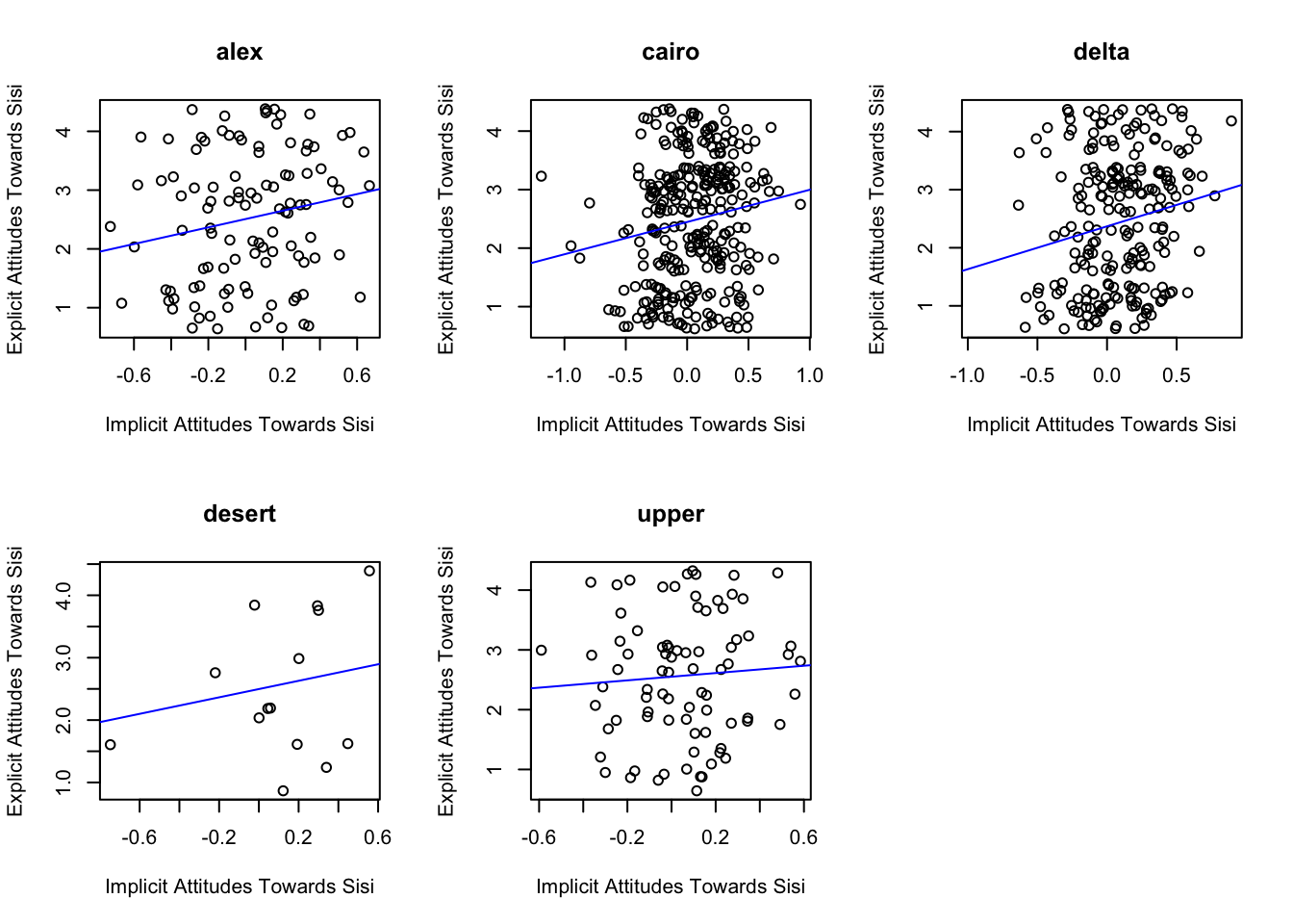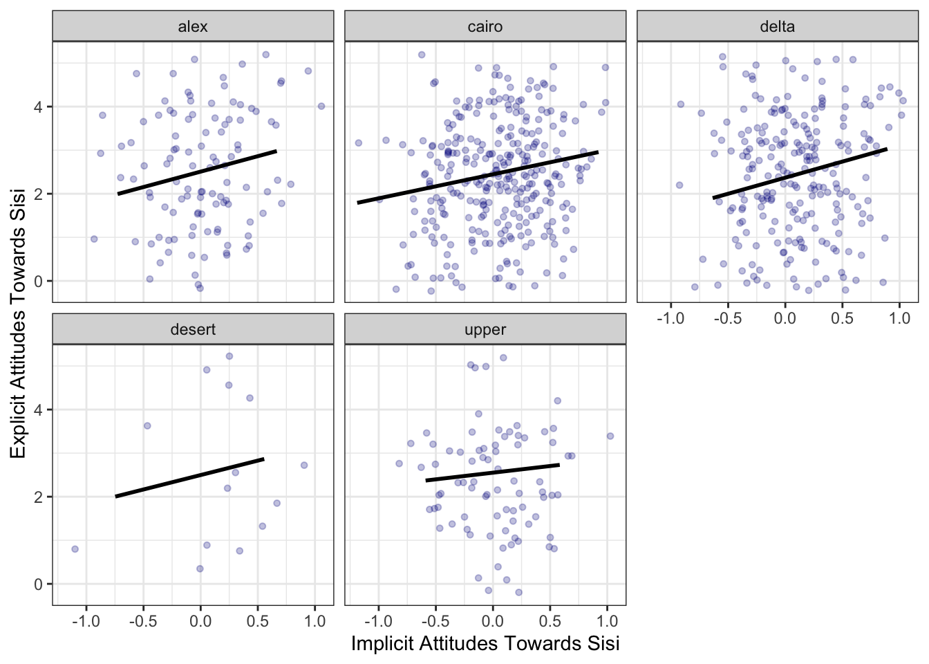 - Create scatterplots of explicit and implicit support for Sisi for the Christian and Muslim subsets of the data.