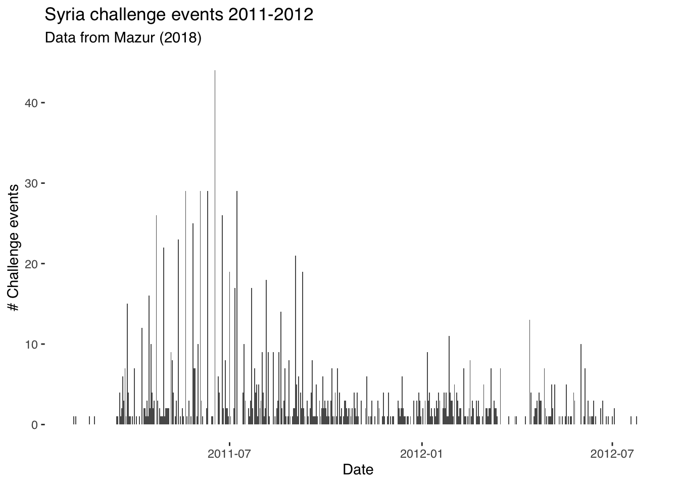 This week we are analysing event data. Event data takes multiple forms, as we saw from the readings this week. Often, it takes the form of so-called “event catalogues”. See this article by Charles Tilly for an overview of their use and some theoretical reflections on what they can teach us. The data we will be using this week comes from a recently published article by Kevin Mazur on the patterns of protest (or “challenge”) seen during the early stages of the 2011 Syrian Uprising. The original replication materials can be found here. Download them from here if you want to get all of the files. Alternatively, you can download them from my GitHub page as below.