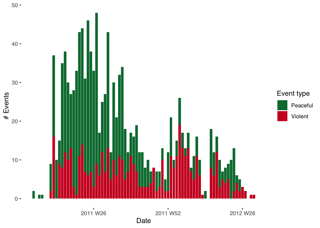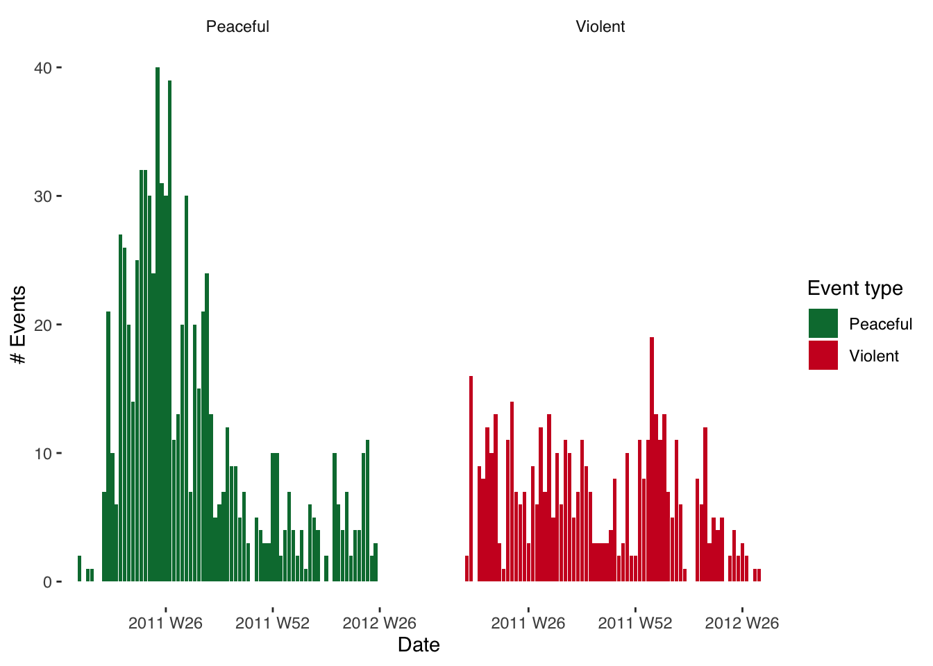 We might also want to look into the patterning of violent and peaceful events over time. To facilitate interpretation, we’ll first aggregate over a higher level of temporal aggregation and sum events by week. We can do this with the package tsibble (for more information on this package and another package–lubridate–useful for reshaping timeseries data, see these pages).
