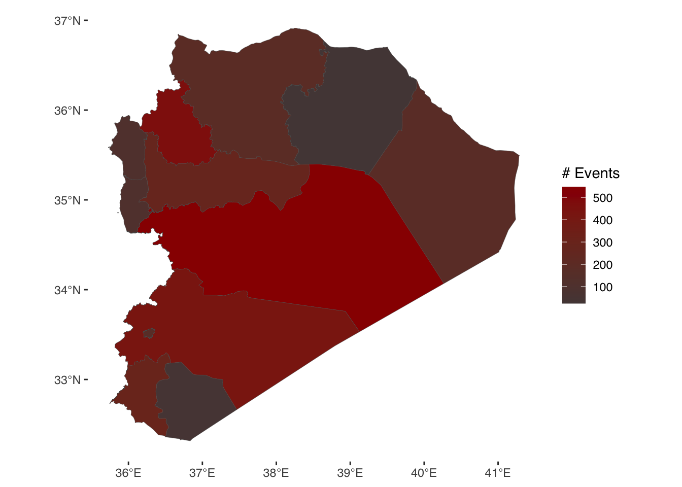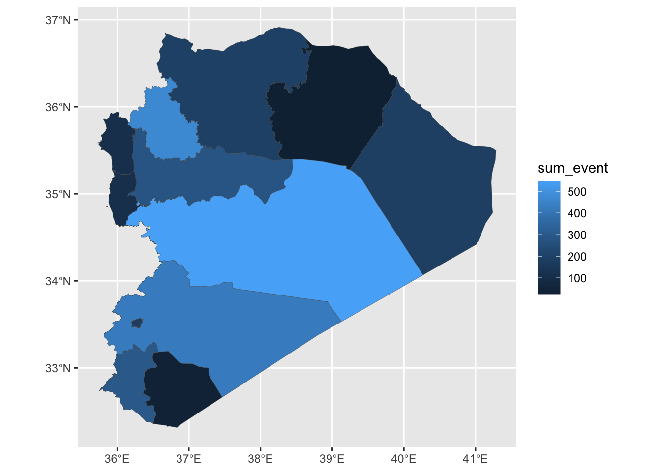 Then we can merge the shapefile with the aggregated event data by typing syr_shp <- merge(syr_shp, syr_events, by="NAME_EN"). Here, we’re simply pasting the names of the two objects to be merged—syr_shp and syr_events—separated by commas and then specifying the name of the common identifier by writing by="NAME_EN".