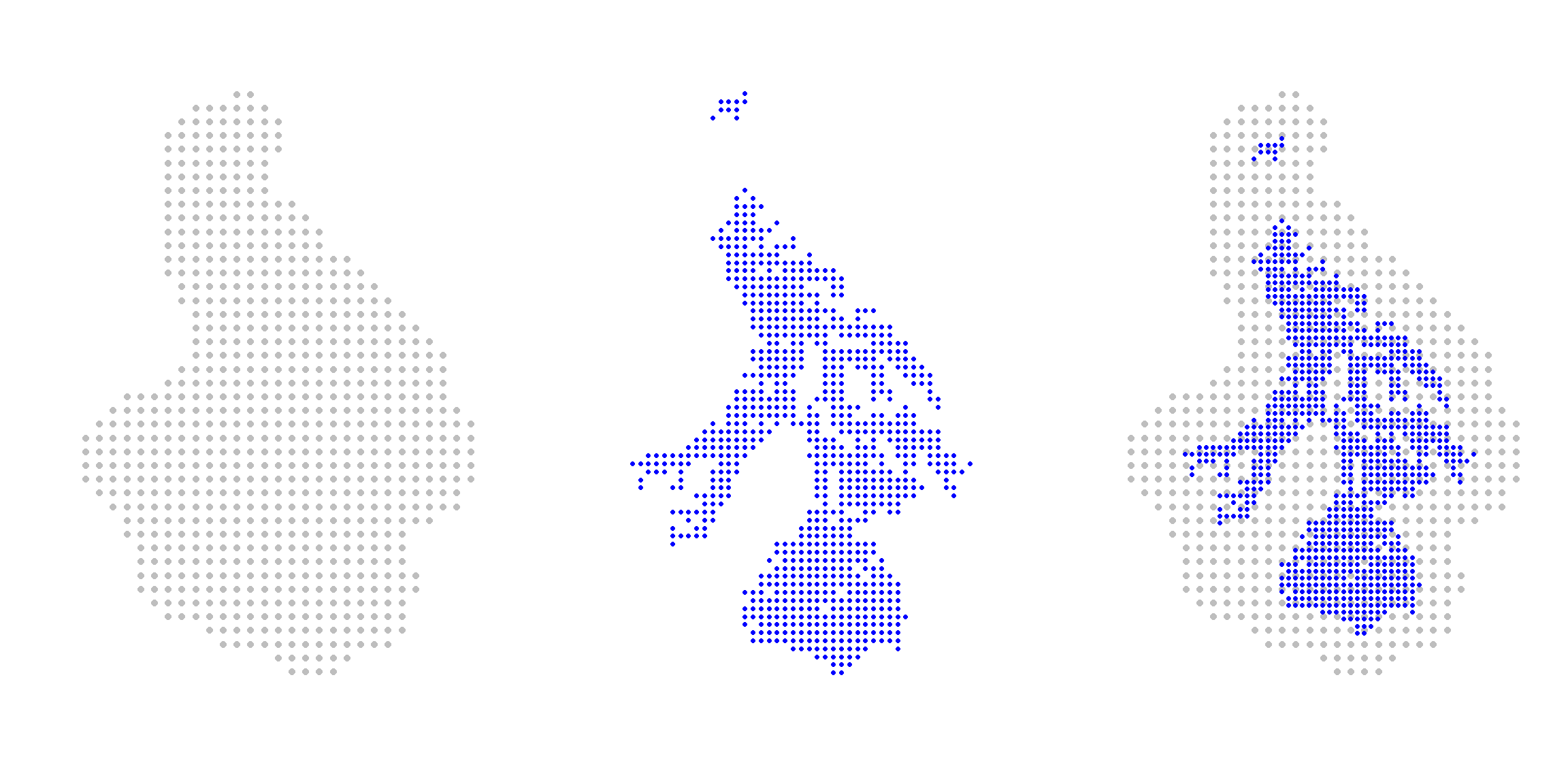 plot(statespace, pch = 16, cex = 1, col = "grey", asp = 1, axes = FALSE, xlab = "", ylab = "")