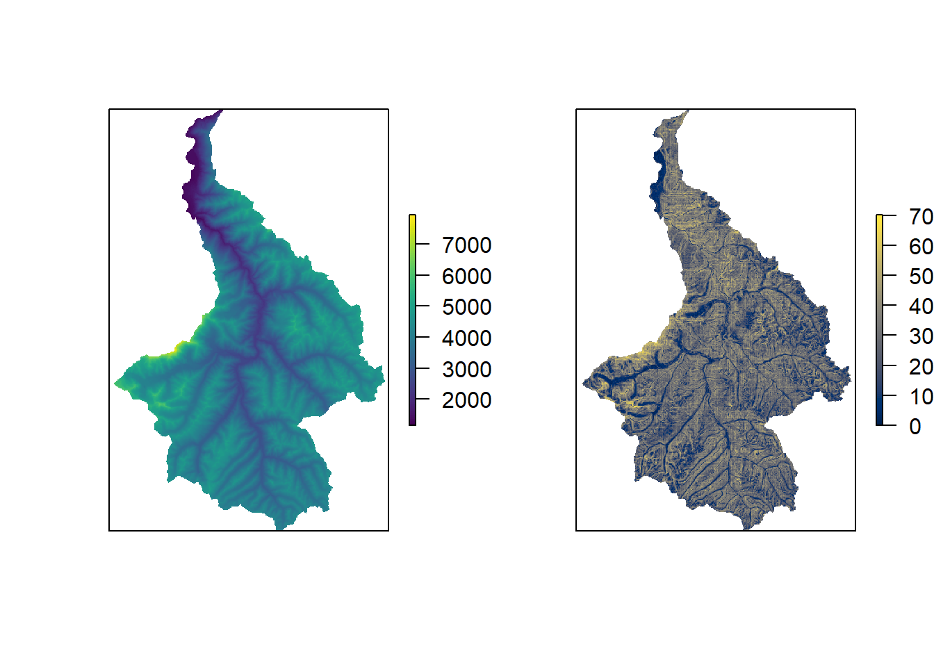 Luckily, elevation layers are available so we can use that (elev), and slope can be derived using the terrain() function from the raster package.