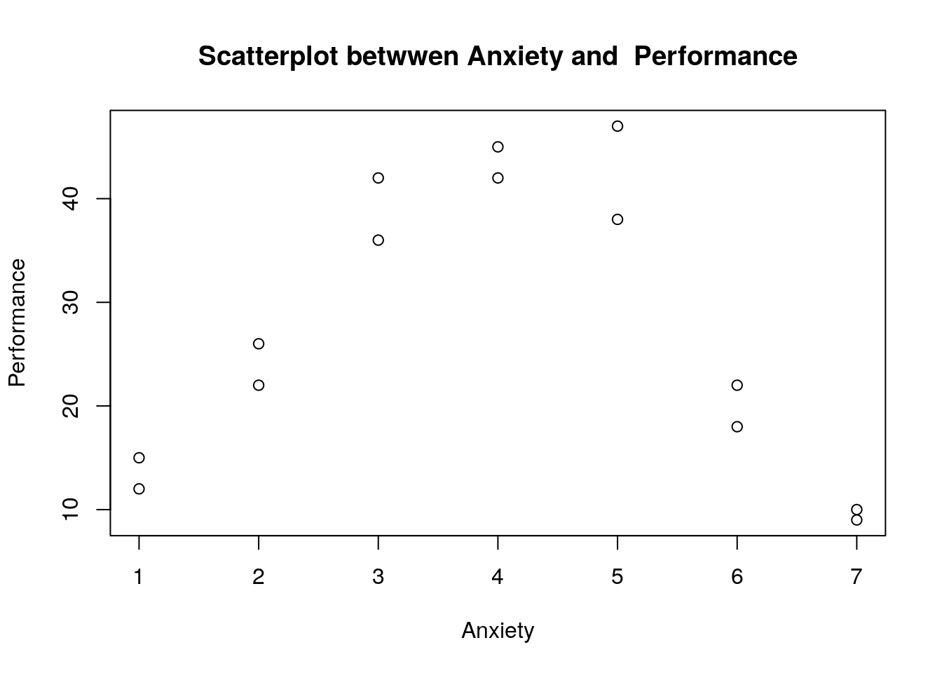plot(curvreg_data$anxiety,curvreg_data$perform, main="Scatterplot betwwen Anxiety and Performance",xlab="Anxiety",ylab="Performance")