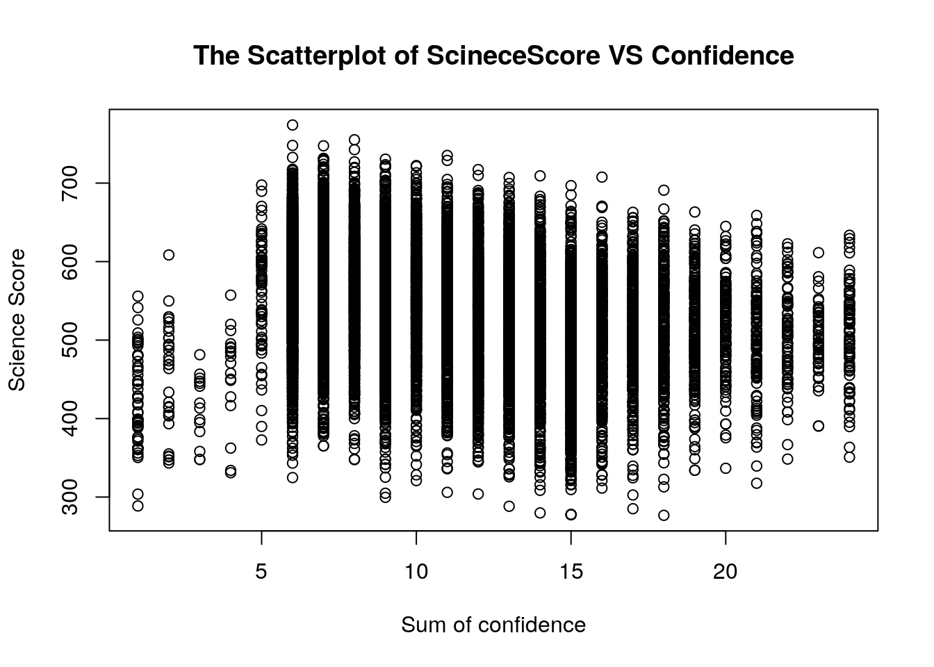 plot(confi_VS_sciscore, main="The Scatterplot of ScineceScore VS Confidence",xlab="Sum of confidence",ylab="Science Score")