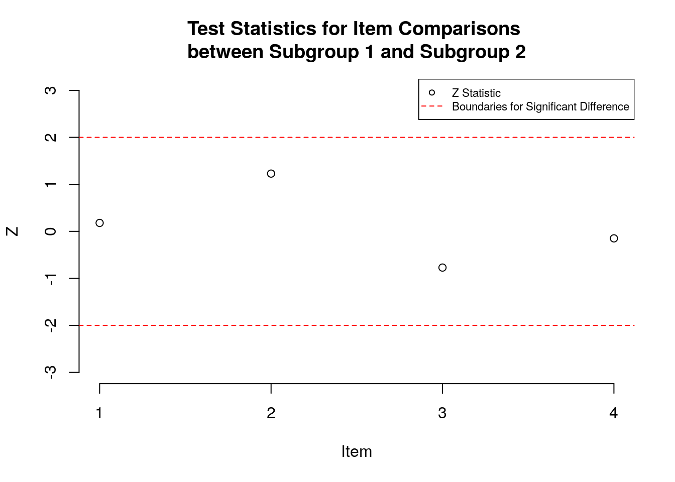Figure 1 shows a plot of the z-statistics for the four survey items; these values are also presented numerically in Table 1. In the figure, the x-axis shows the item identification numbers, and the y-axis shows the value of the z-statistic. Boundaries at +2 and -2 are indicated using dashed horizontal lines to highlight statistically significant differences in item difficulty between subgroups. Examination of these results indicates that the items were not significantly different in difficulty between the two subgroups. In addition, there were both positive and negative z statistics, indicating that although the differences in item difficulty were not significant, there were some items that were easier to endorse for Subgroup 1 and others that were easier to endorse for Subgroup 2.