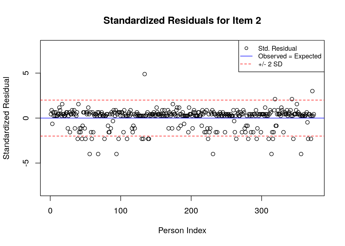 For example, residual analyses could help a researcher identify an item in an attitude survey for which there were many unexpected responses. Further investigation of these responses using residuals could reveal that the unexpected responses occurred when participants who had otherwise generally negative attitudes, as reflected in low locations on the construct, gave higher-than-expected (i.e., more positive) responses to the item than would be expected given their location estimates. This information could reveal a potential issue related to the item content, which might be interpreted differently for participants with low locations on the construct. Alternatively, this information might provide insight into the nature of the construct and highlight a new direction for future research. Likewise, analysis of residuals associated with individual participants could help researchers identify participants who gave frequent or substantial unexpected responses to subsets of items.