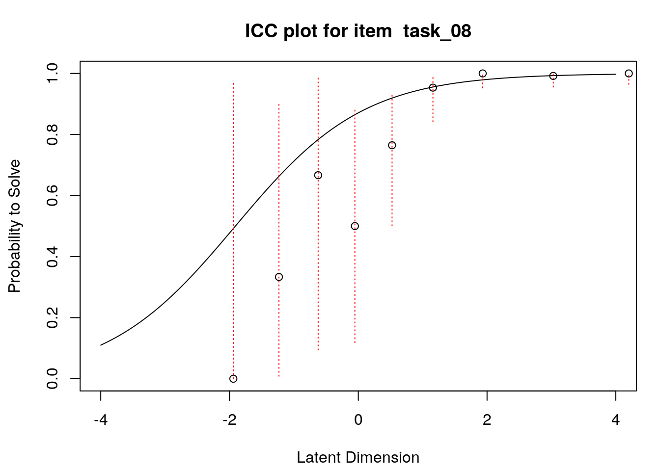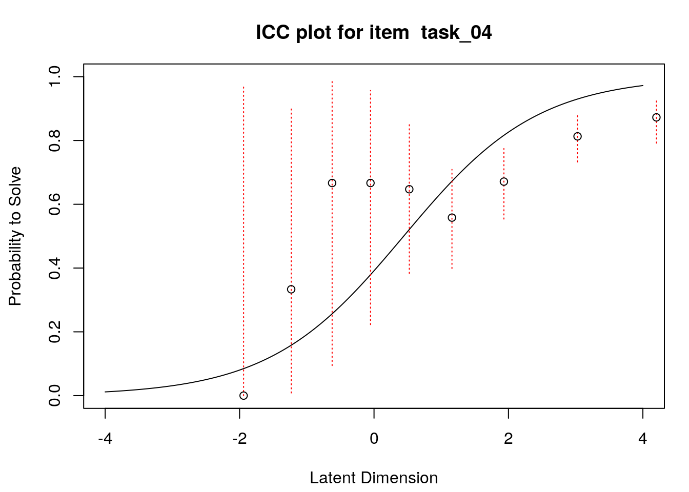 A separate plot is produced for each item. In each plot, the y-axis shows model-predicted probability for a correct or positive response (labeled “Probability to Solve” by default in the eRm package)), and the x-axis shows the latent variable (labeled “Latent Dimension” by default in the eRm package).The solid line shows the model-expected IRF. Open-circle plotting symbols show the observed probability for a correct response at various locations on the latent variable. Dashed vertical lines show a 95% confidence interval around the observed probabilities. Alignment between the model-expected IRF and the observed probabilities (i.e., circles that are close to the model-expected IRF) provide evidence of good model-data fit.