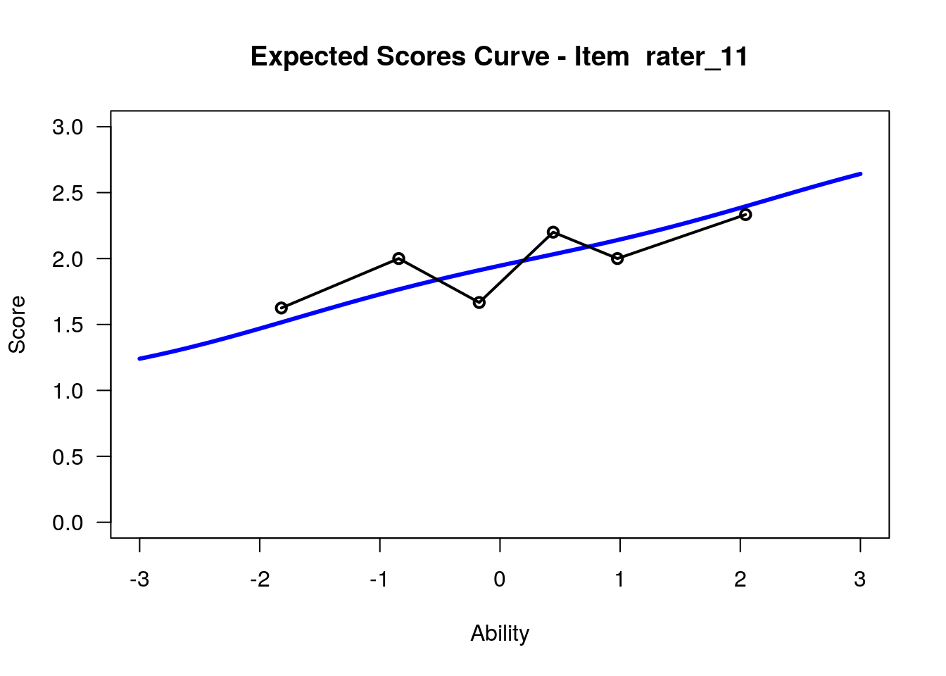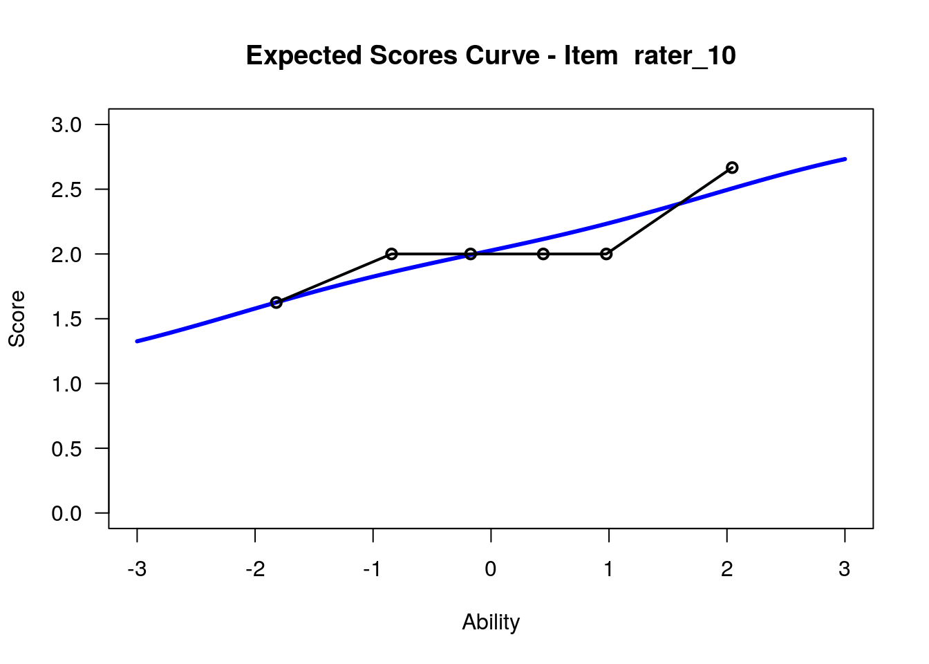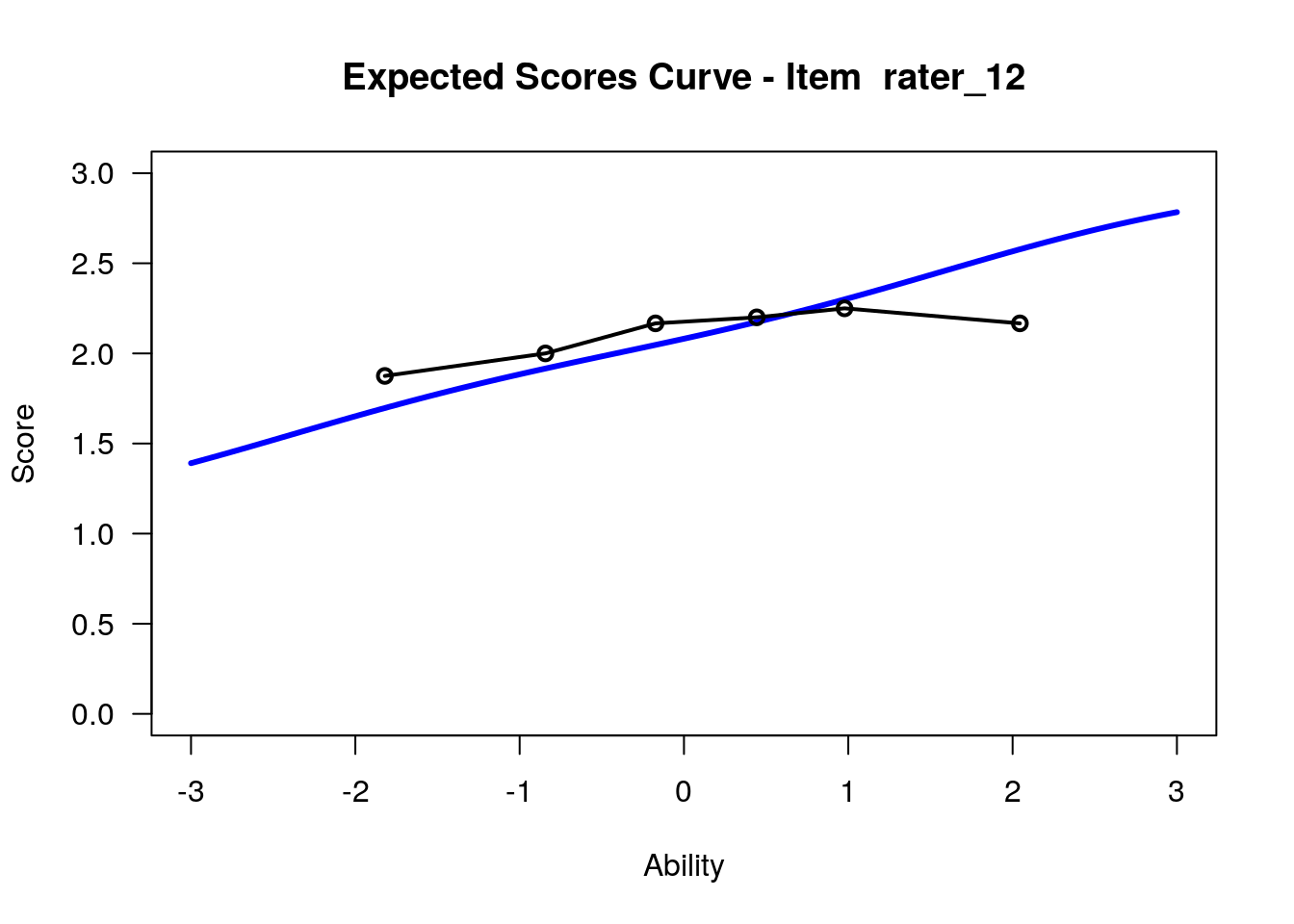 In our analysis, we will treat the 12 raters as 12 polytomous “items” that share the three-category rating scale structure. Raters with high “difficulty” calibrations can be interpreted as severe – these raters assign low scores more often. Raters with low “difficulty” calibrations can be interpreted as lenient – these raters assign high scores more often.