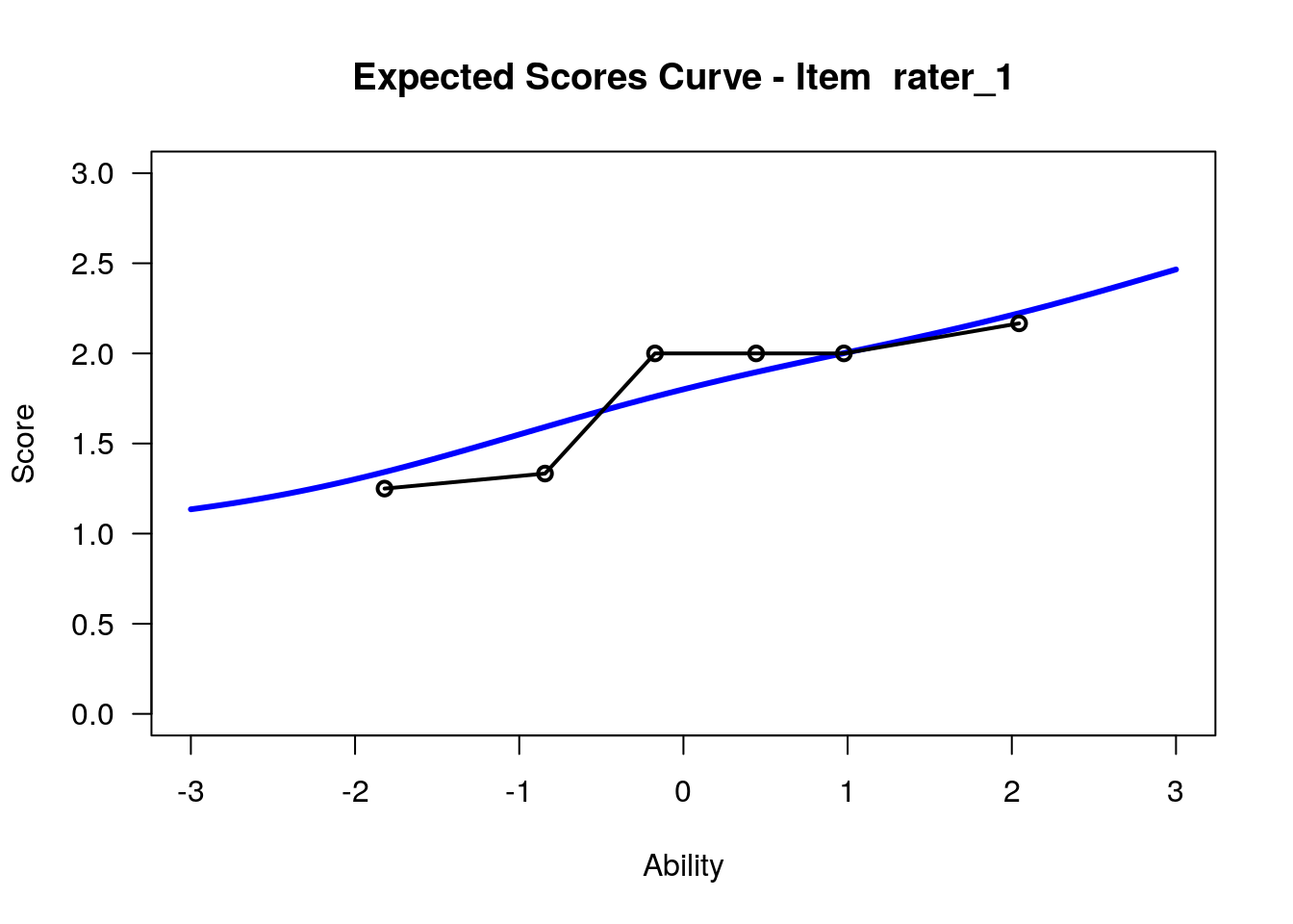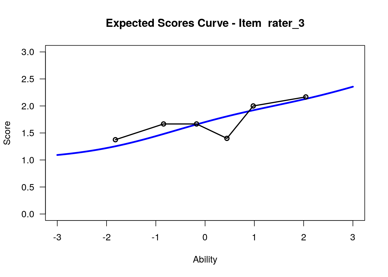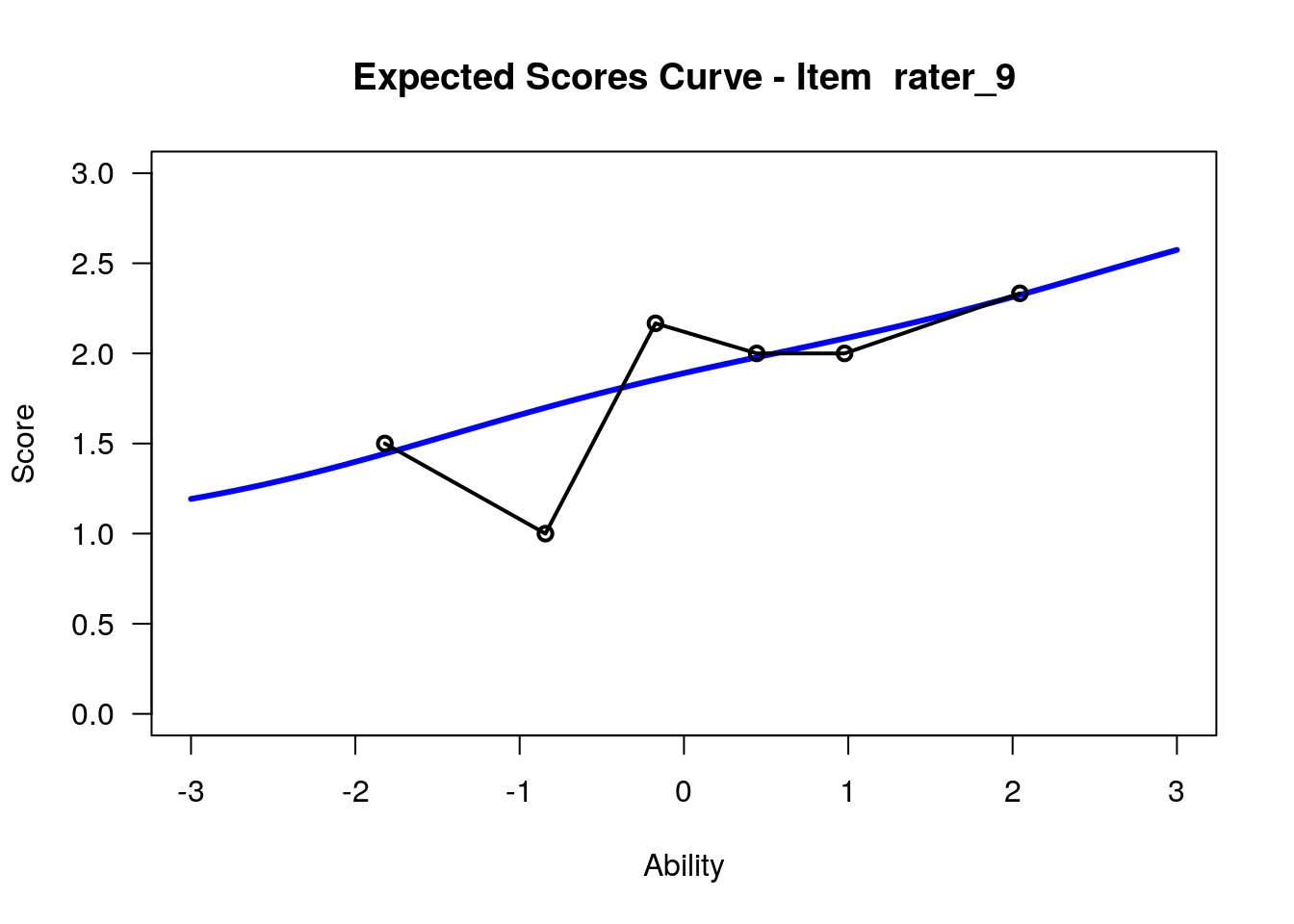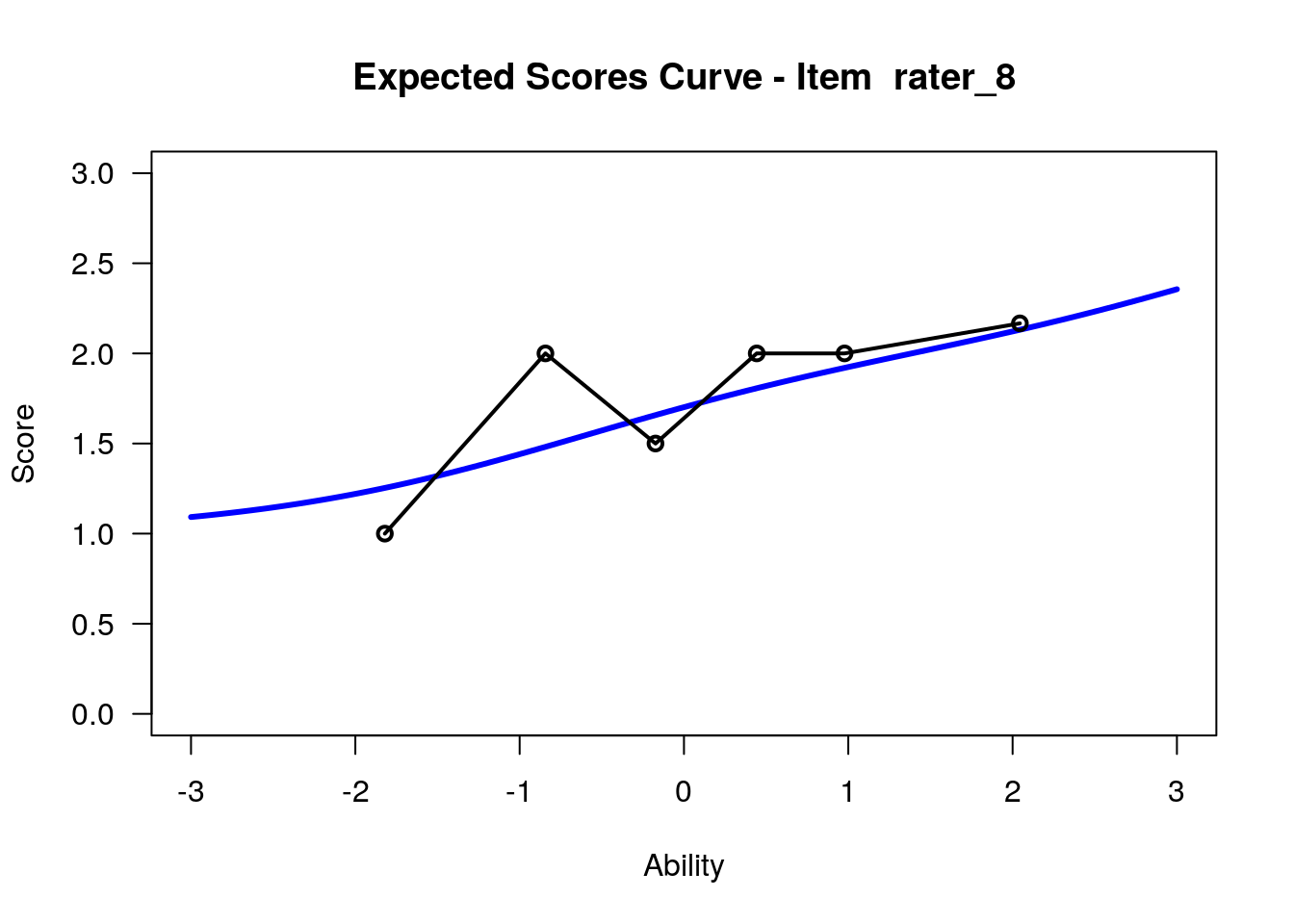 In our analysis, we will treat the 12 raters as 12 polytomous “items” that share the three-category rating scale structure. Raters with high “difficulty” calibrations can be interpreted as severe – these raters assign low scores more often. Raters with low “difficulty” calibrations can be interpreted as lenient – these raters assign high scores more often.
