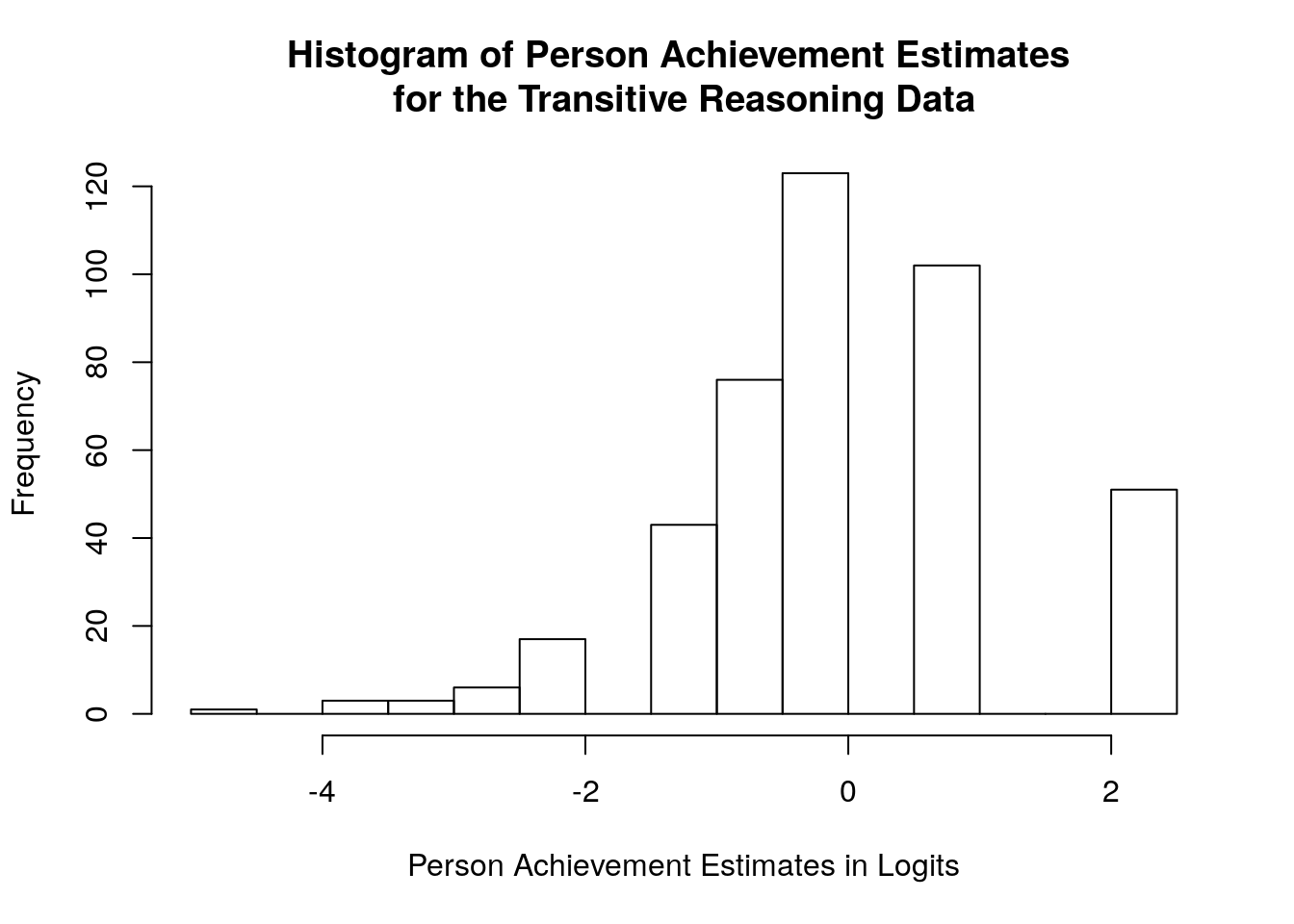 hist(achievement$theta, main = "Histogram of Person Achievement Estimates \nfor the Transitive Reasoning Data",