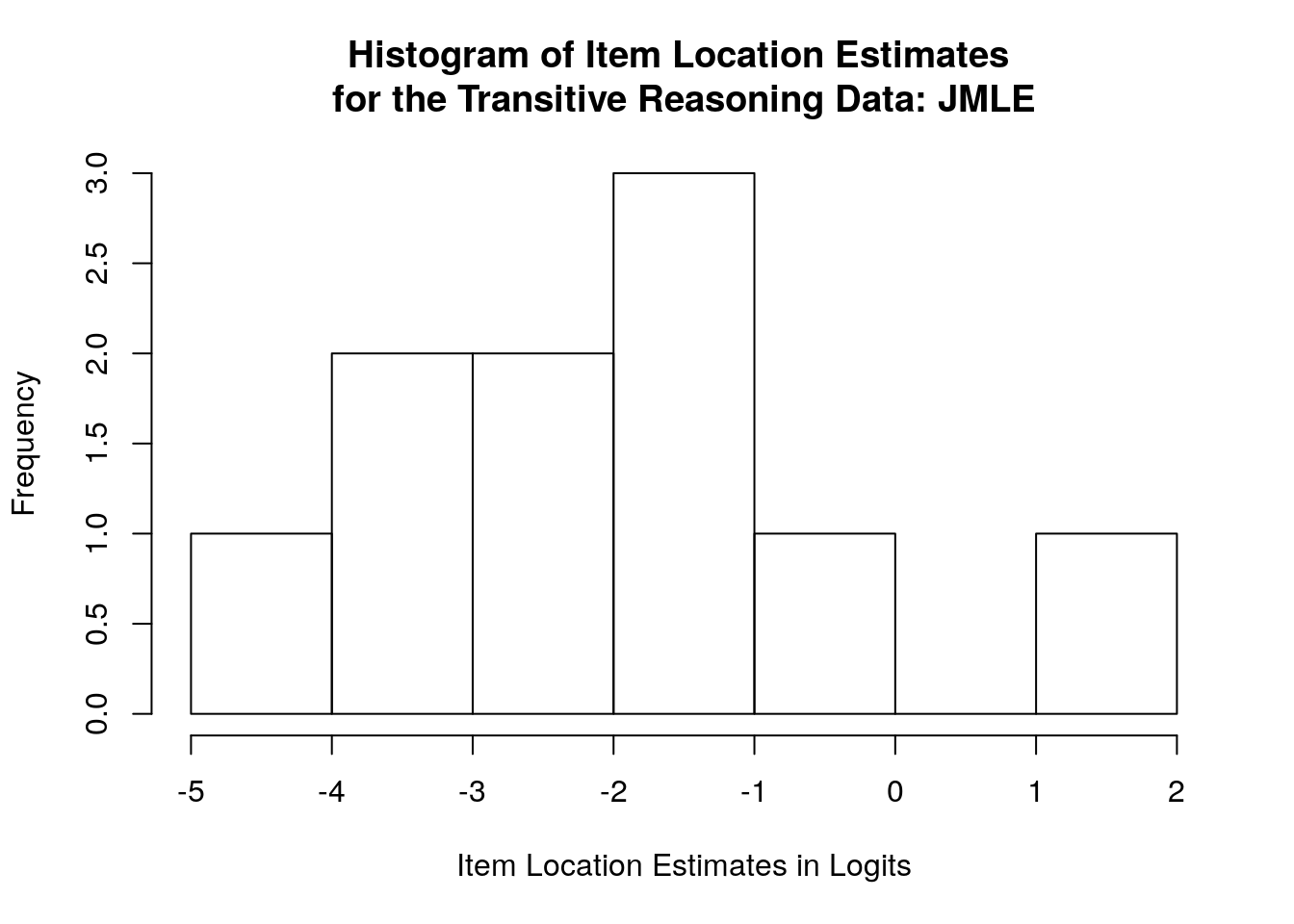 hist(difficulty$xsi, main = "Histogram of Item Difficulty Estimates for the Transitive Reasoning Data",