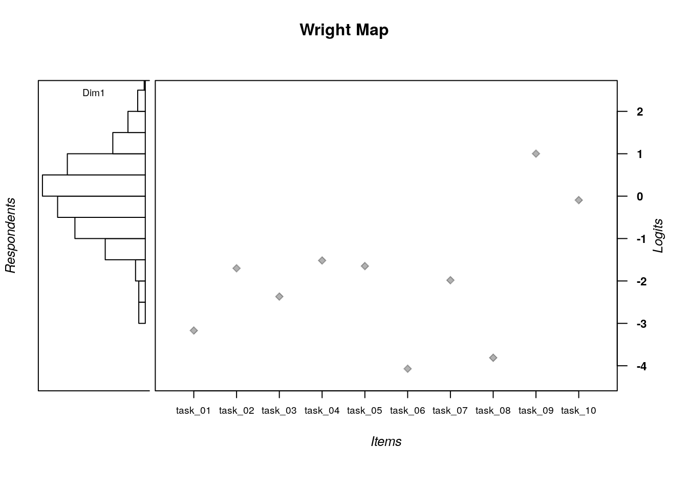 The item difficulty parameters (xsi) are the item location estimates on the logit scale that represents the latent variable. Assuming that the responses are scored such that lower scores (x = 0) indicate lower locations on the latent variable (e.g., incorrect, negative, or absent responses), then lower item estimates on the logit scale indicate items that are more difficult or require persons to have relatively higher locations on the construct to provide a correct response. On the other hand, higher item estimates on the logit scale indicate items that are easier or require persons to have relatively lower locations on the construct to provide a correct response. In our analysis, Task 9 is the most difficult item (xsi = 1.00), whereas Task 6 is the easiest item (xsi = -4.07).