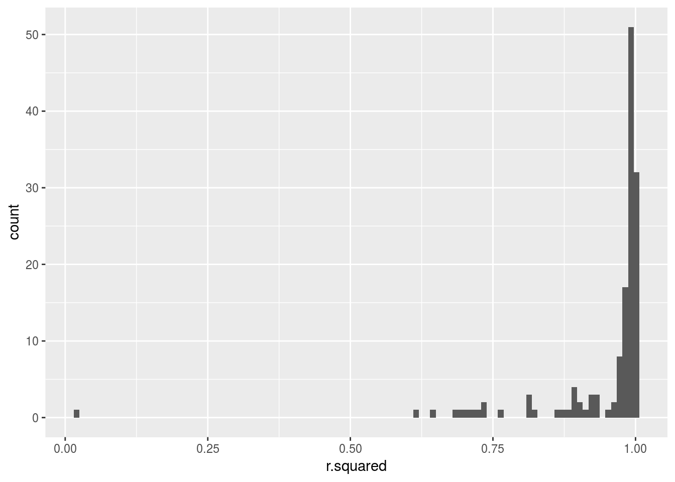 # drop the list columns, `data`, `model` and `resid`Note that each model gives a set of metrics.