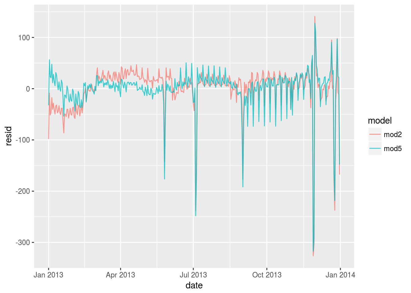 wdayvariable that combines the day of week, term (for Saturdays), and public holidays. What do the residuals of that model look like? chron package has a function calledis.holidayRequires additonal work to identify American Public holidays