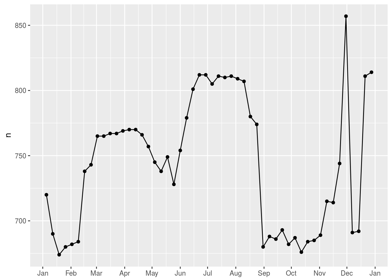 n ~ wday + ns(date, 5)to look like? Knowing what you know about the data, why would you expect it to be not particularly effective?