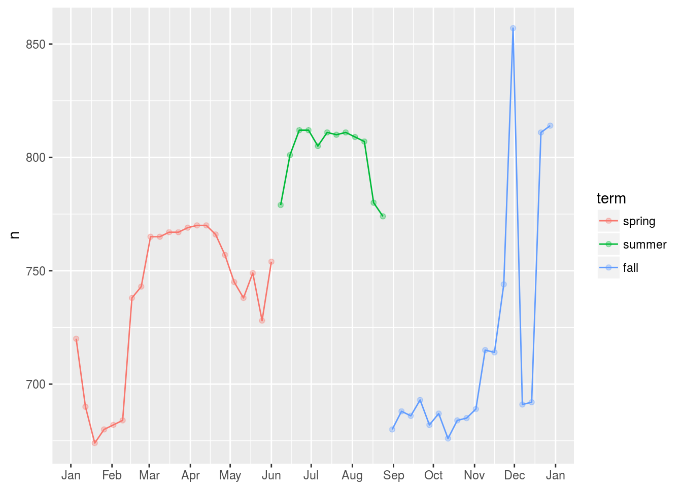 Splines does better job when n changes slowly but it has a systematic overestimation in the fall semester. It shouldn’t be particularly effective.