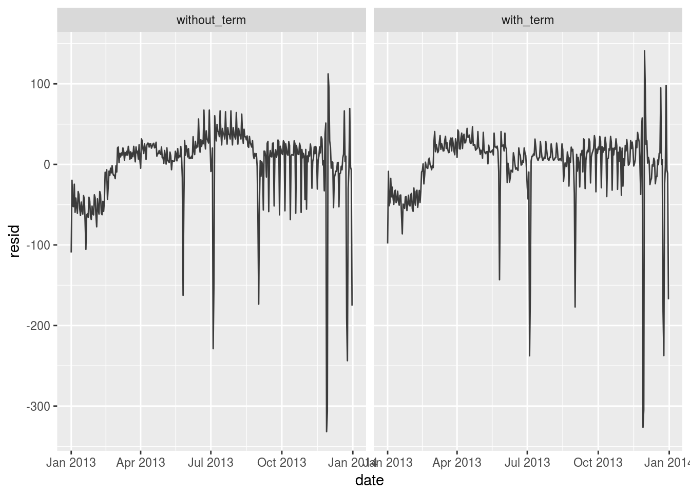 We get a warning saying that prediction from a rank-deficient fit may be misleading. This is understandable since our term2 variable is constructed from term and wday. The prediction result is exactly the same.