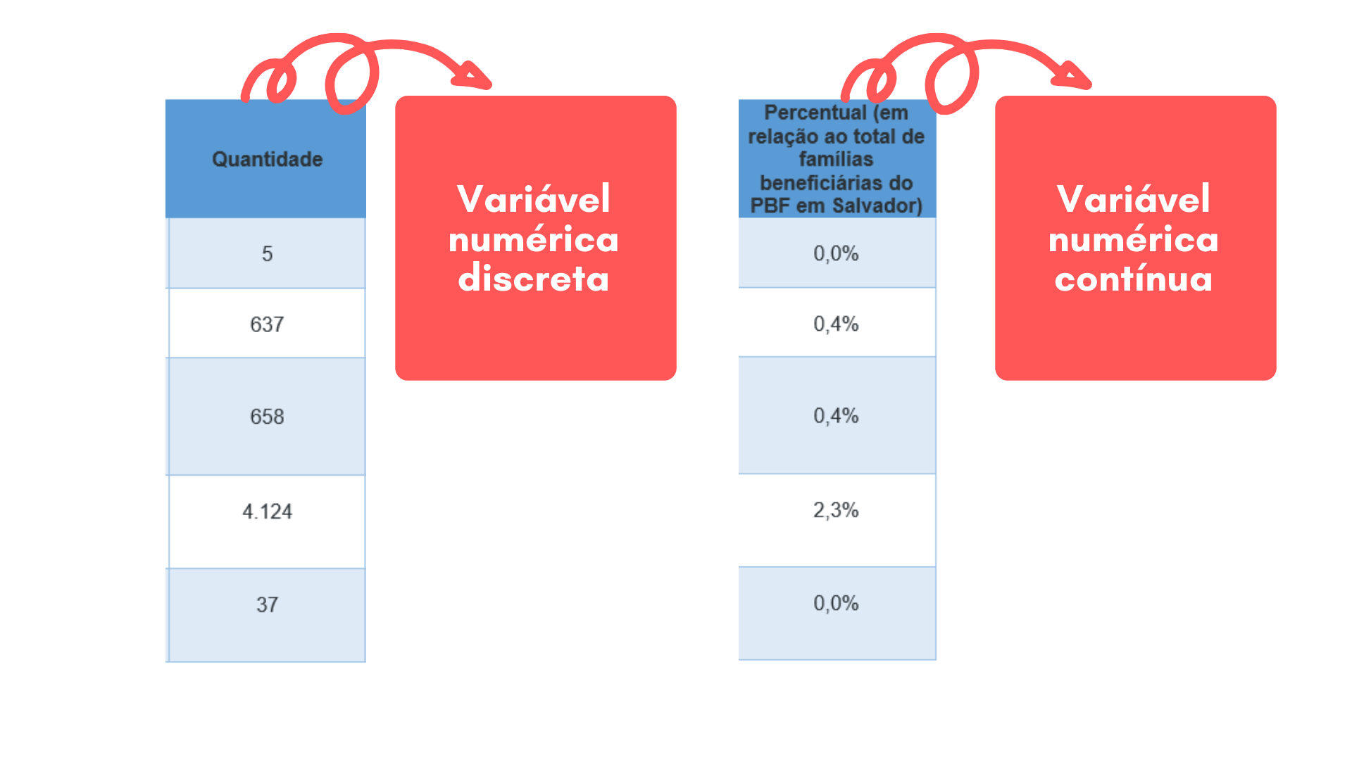 No exemplo da seção anterior, o nosso objeto de estudo foram os grupos prioritários ao Programa Bolsa Família. E as variáveis que caracterizaram o nosso objeto de estudo foram: “Grupo”, que indica quais são esses grupos prioritários; “Quantidade”, que indica a quantidade de famílias que compõem esses grupos e “Percentual” que indica a porcentagem que esses grupos representam em relação ao total de beneficiários em Salvador.