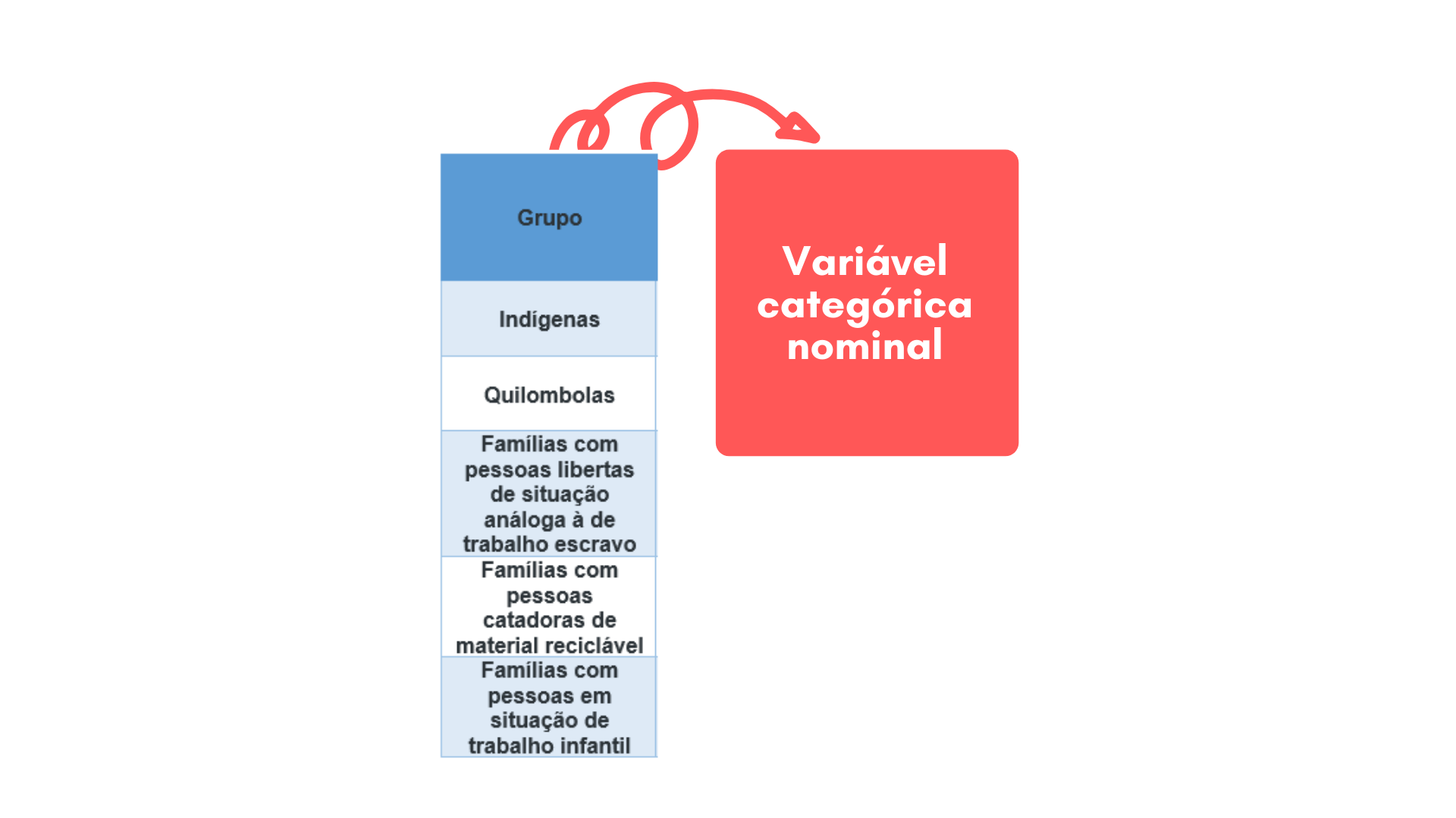 As linhas, partes horizontais da tabela, que também podemos chamar de amostras, representam indivíduos ou observações, que são os nossos objetos de estudo. No nosso exemplo, as observações são os grupos de famílias prioritárias ao PBF: “Indígenas”, “Quilombolas”, “Famílias com pessoas libertas de situação análoga à de trabalho escravo”, “Famílias com pessoas catadoras de material reciclável” e “Famílias com pessoas em situação de trabalho infantil”