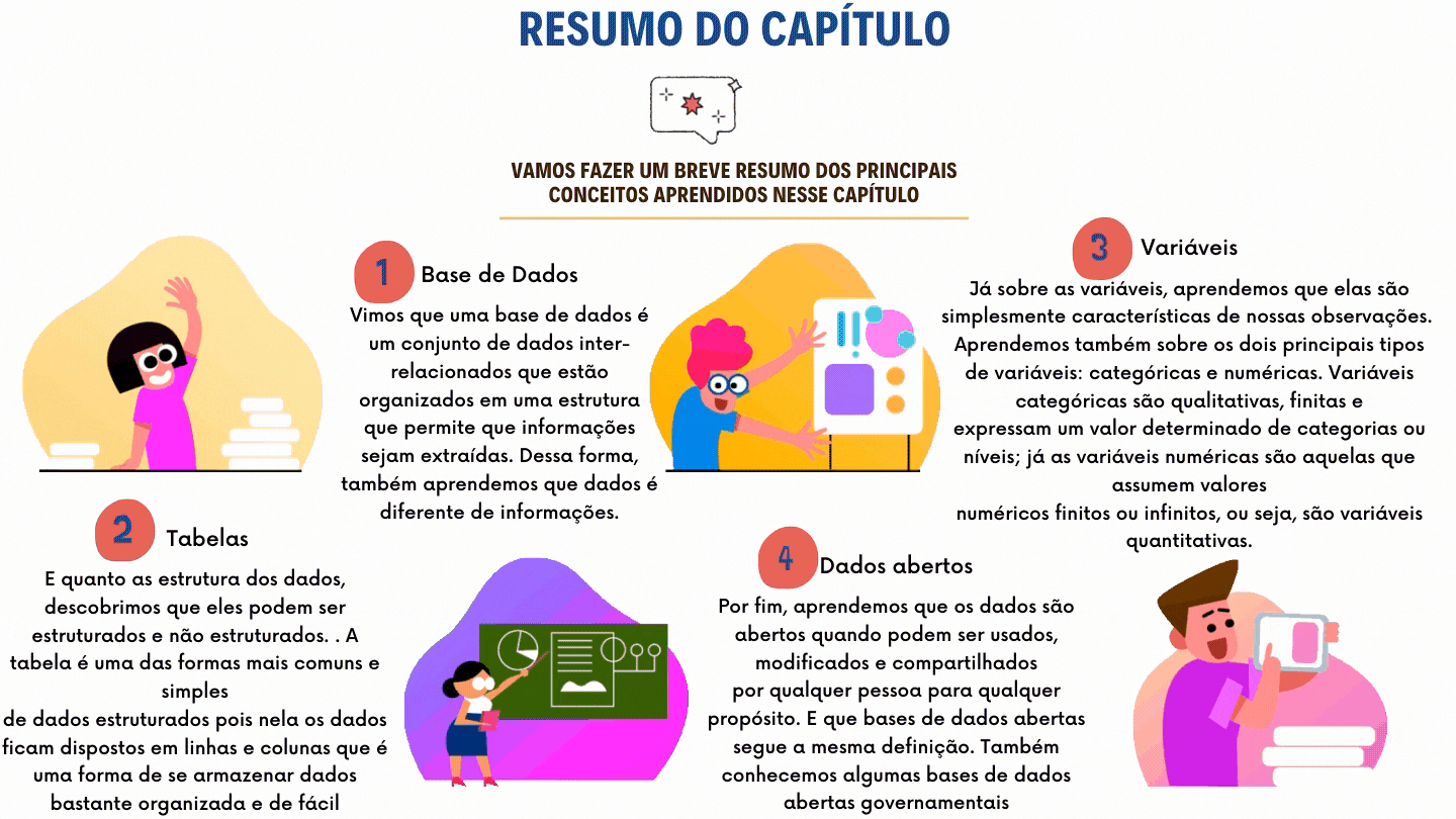 Sem os dados, não existiria ciência de dados, e neste capítulo aprendemos um pouco mais sobre eles. No próximo capítulo, “Visualização e Ciência de Dados”, vamos conversar sobre um tema essencial para futuros cientistas de dados tal como você. Mas antes, confira um breve resumo do que aprendemos: