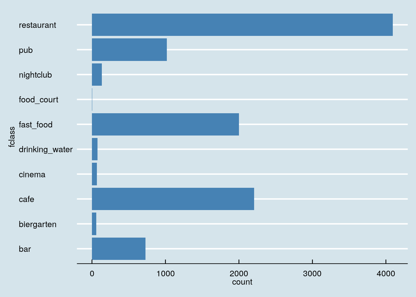 ggplot(OSM_sf_building.night,aes(fclass))+ geom_bar(fill='steelblue')+theme_economist()+coord_flip()