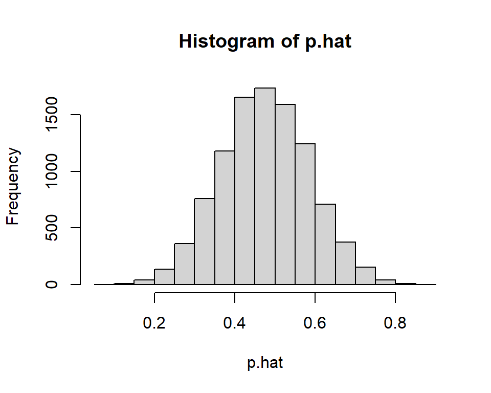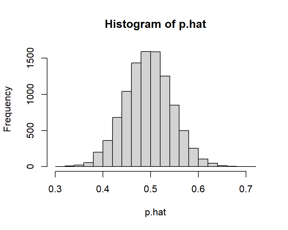 - Suppose we flipped a coin \(n=20\) times a day, computed \(\hat{p}\) each day, and graphed all of our \(\hat{p}\) in a histogram. In this case, it seems like the mean of all of our \(\hat{p}\)s should be equal to the parameter’s true value \(p=0.50\). (What does that histogram remind you of?)
