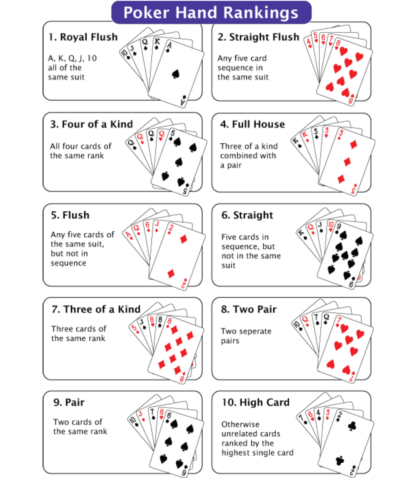 A graph of the hands, from the strongest (royal flush, almost impossible to get), to the weakest (high card) is on the next page. Notice a “flush” (all cards same suit) beats a “straight”” (all cards in sequence or “order”) and that both of these hands beat a “three of a kind”.