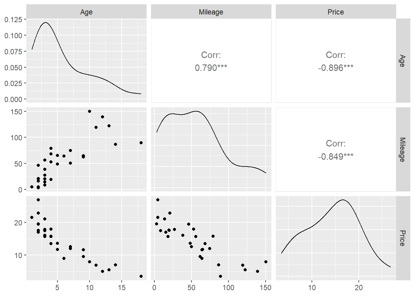 \[\hat{Price} = 21.738 - 0.791Age - 0.053Mileage\]