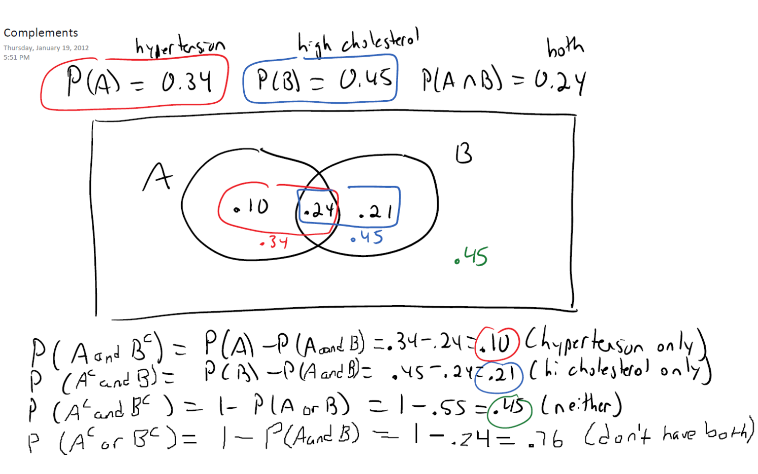 \(P(A \: and \: B^c)=P(A)-P(A \: and \: B)=0.34=0.24=0.10\) This is the probability of event A only (hypertension and NOT high cholesterol)