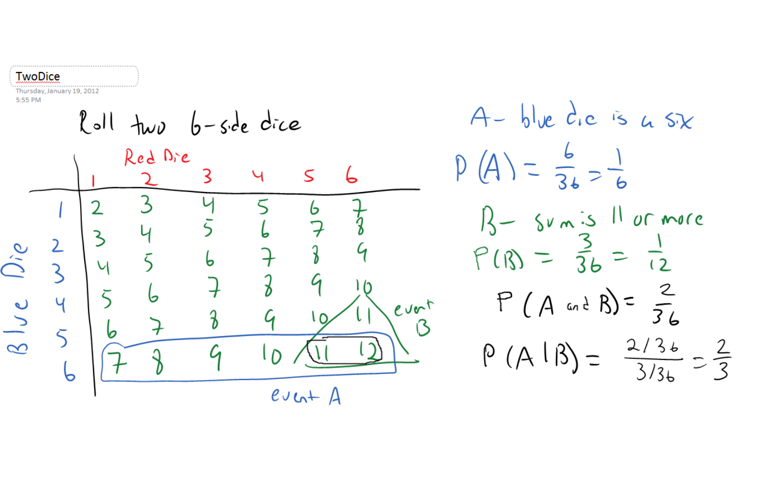Let event \(A\) be the event that the blue die is a `6’ and event \(B\) be the event that the two dice sum to 11 or more (i.e. \(X=11\) or \(12\)). The probabilities of these two events separately are \(P(A)=1/6\) and \(P(B)=3/36=1/12\). However, \(P(A \: and \: B)=2/36\) and \[P(A|B)=\frac{2/36}{3/36}=\frac{2}{3}\]