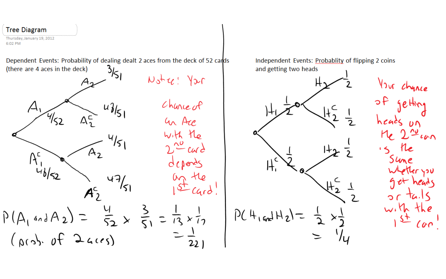 The tree diagram on the next slide looks at the probability of being dealt a pair of aces in holdem poker (dependent events) and the probability of flipping a coin twice and getting two heads (independent events).