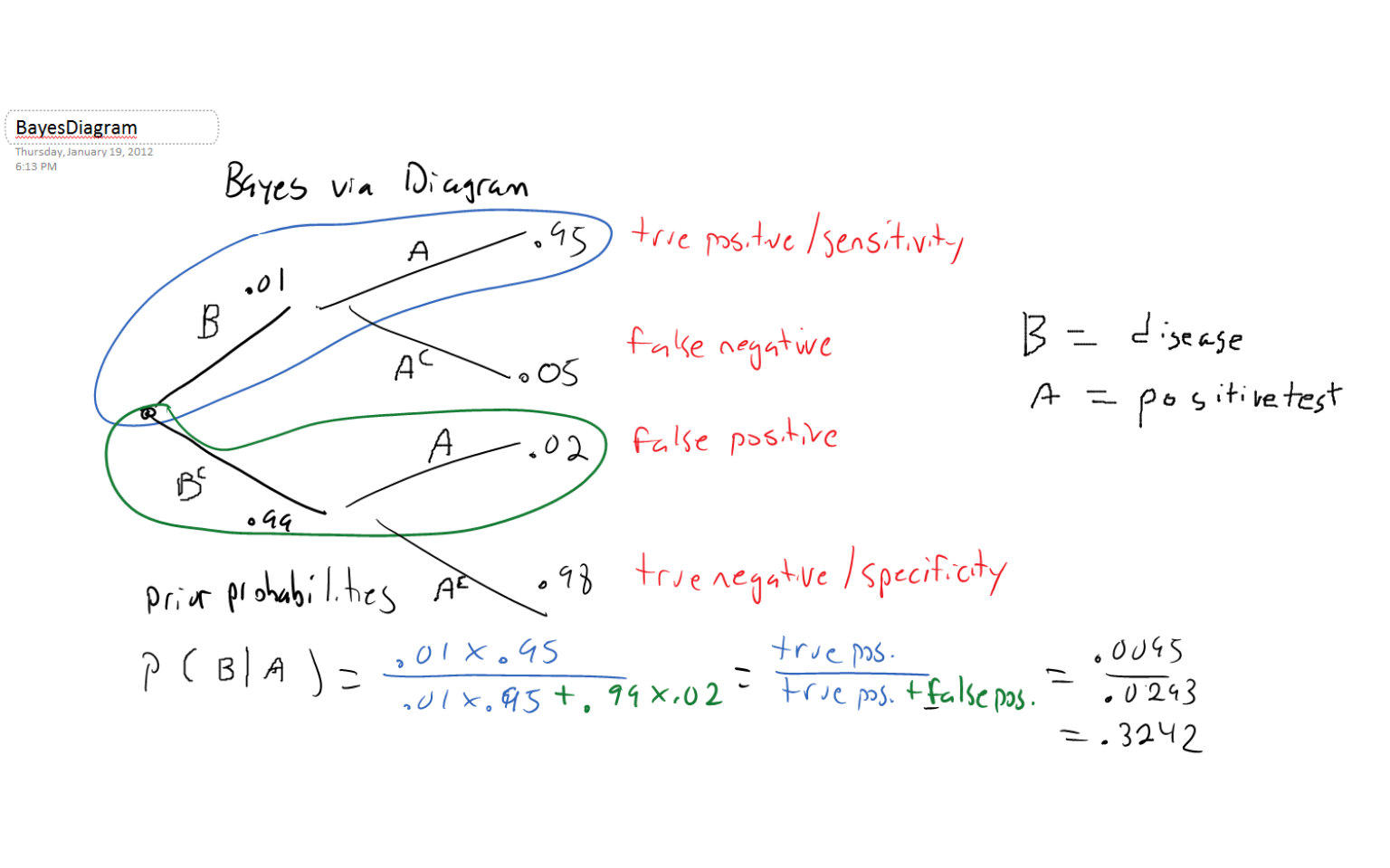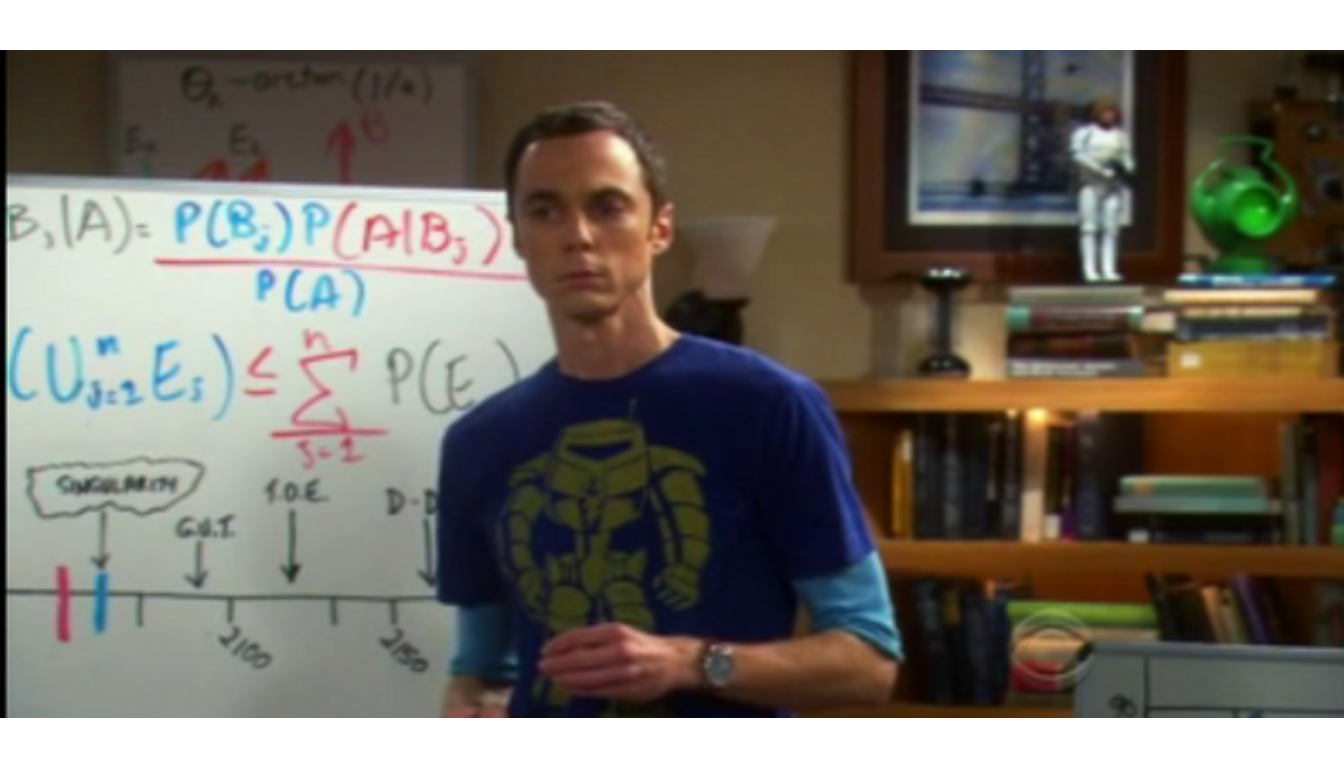 Sheldon Cooper from the sitcom The Big Bang Theory is using Bayes’ Theorem (with slightly different notation), along with a result called Boole’s Inequality that we won’t cover. I saw more Bayesian statistics on Sheldon’s whiteboard on a more recent episode, but I didn’t track down the screenshot.