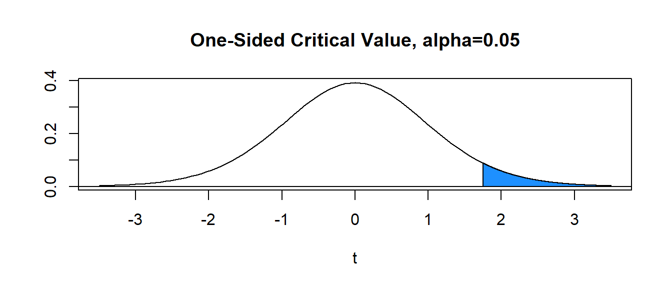 With \(\alpha=0.05\) (area in blue) and \(df=15\), the critical value is \(t^*= 1.753\). Hence, the decision rule is to reject \(H_0\) when the value of the computed test statistic \(t\) exceeds critical value \(t^*\), or reject \(H_0\) if \(t>t^*\). In our problem, \(t=0.951 \not > 1.753=t^*\) and we FAIL TO REJECT the null.