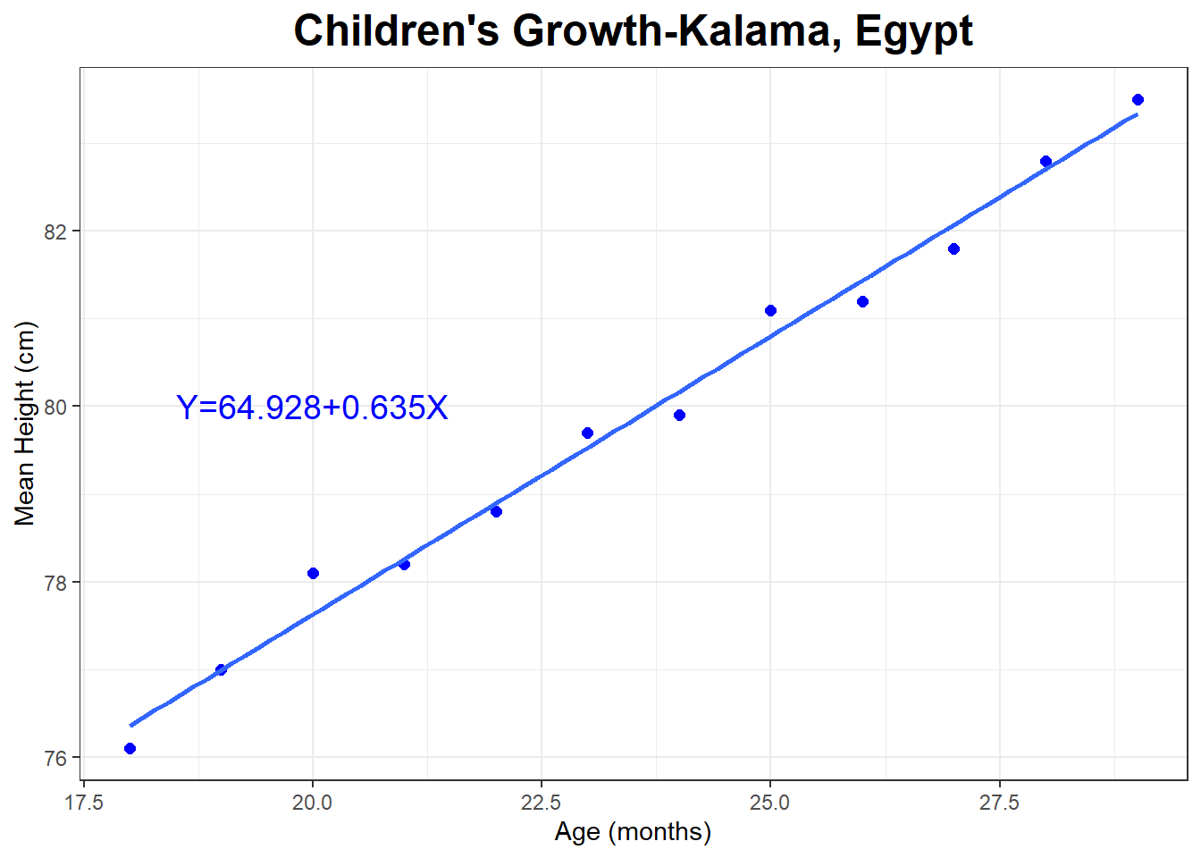 The graph and regression line below show the relationship between the mean height (in cm) and age (in momths) of young children in Kalama, Egypt.