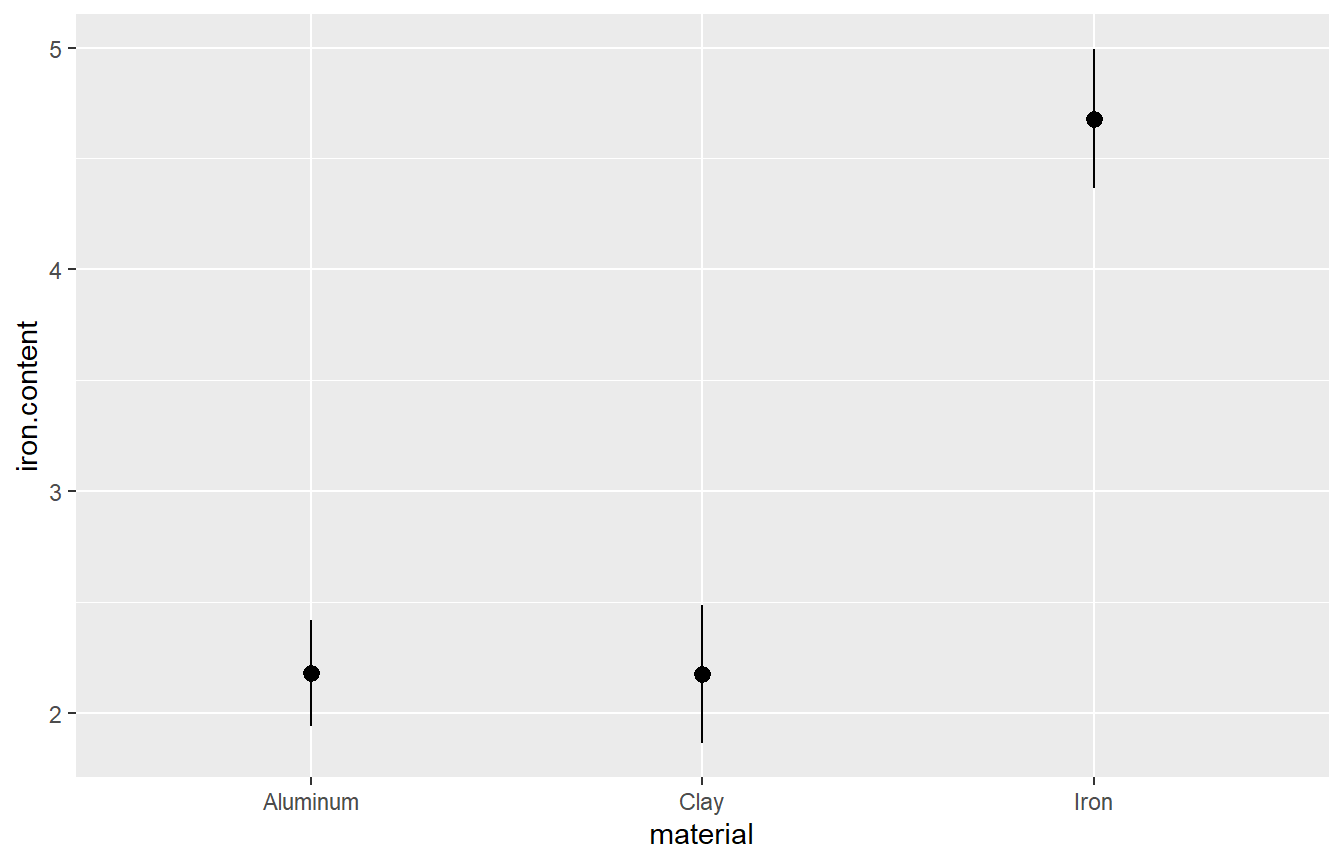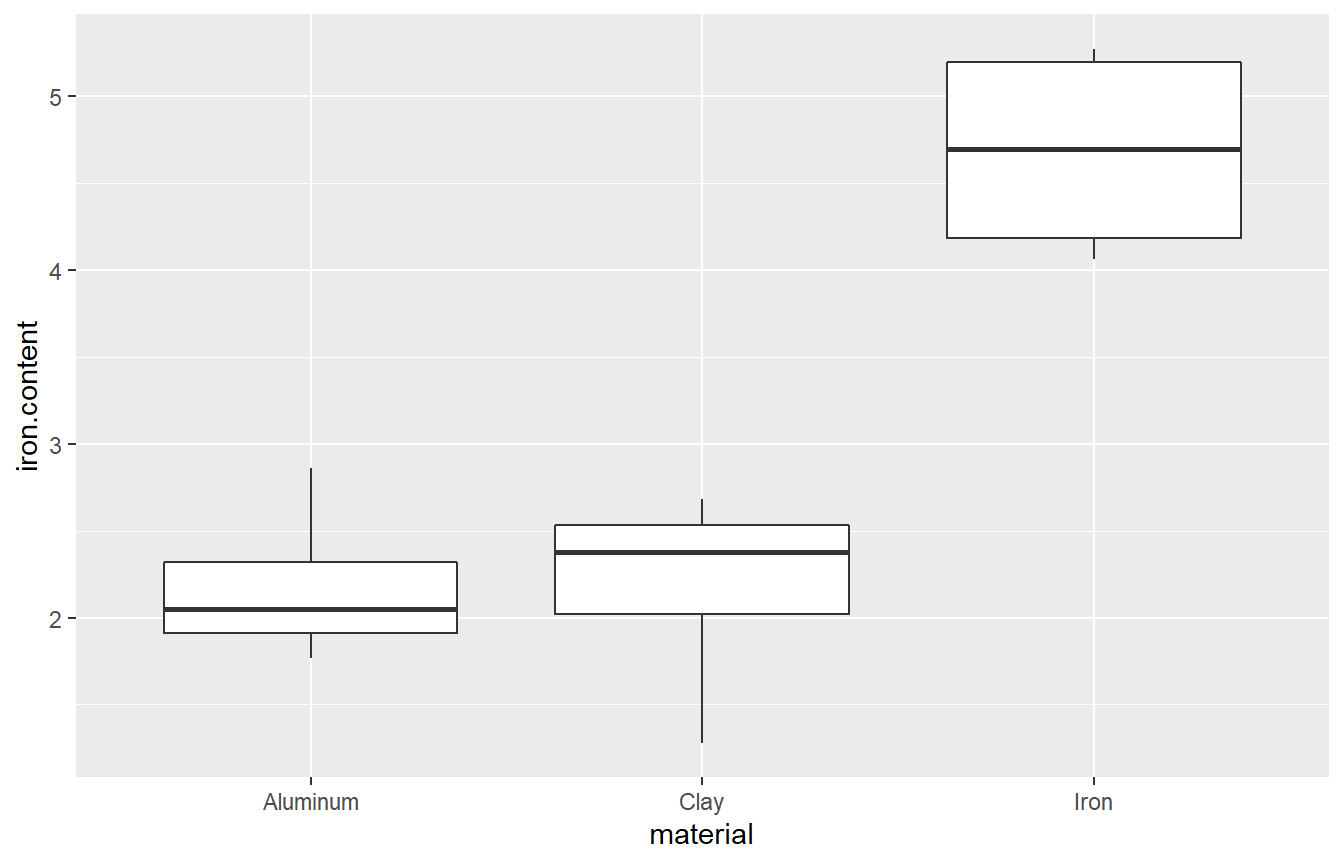 favstats(iron.content~material,data=cooking.pot)## material min Q1 median Q3 max mean sd n missing