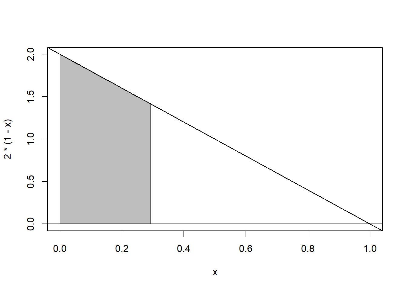 Is the area under the curve and above the \(x-axis\) equal to one? Yes, this can be verified both with simple geometry (i.e. find the area of the right triangle) or with calculus. \[\int_S f(x) dx = \int_0^1 2(1-x) dx = (2x-x^2)|_0^1 = 1 \]
