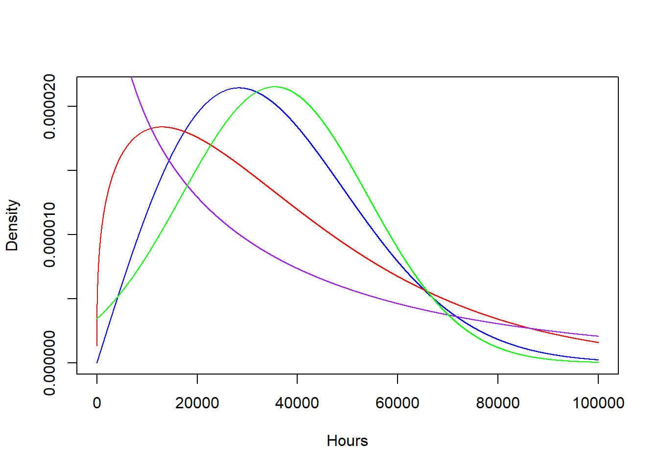 plot(dweibull(bb,shape=2,scale=40000)~bb,type="l",col="blue",xlab="Hours",ylab="Density")