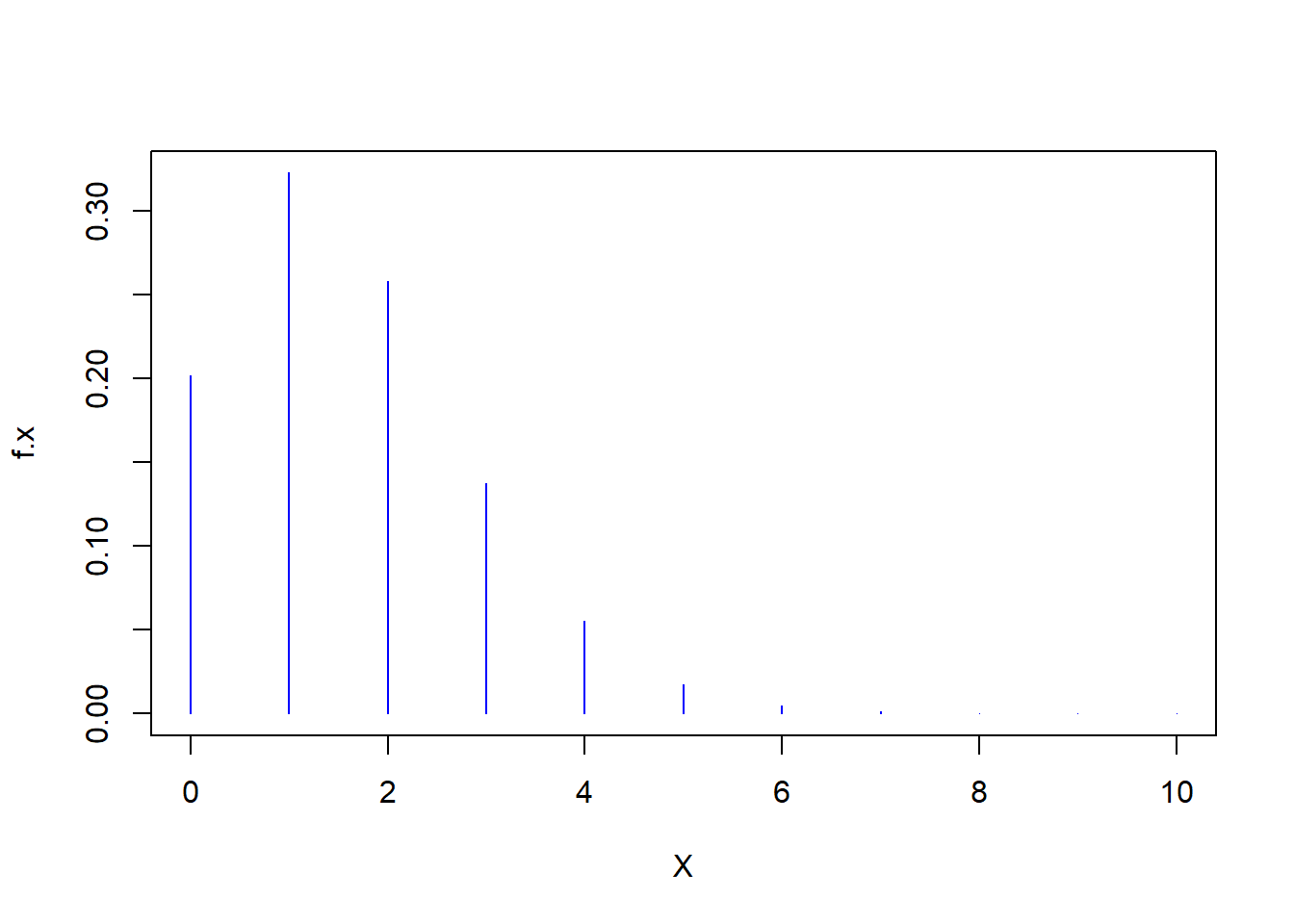 r X <- 0:10 f.x <- dpois(x=X,lambda=1.6) plot(f.x~X,type="h",col="blue") |