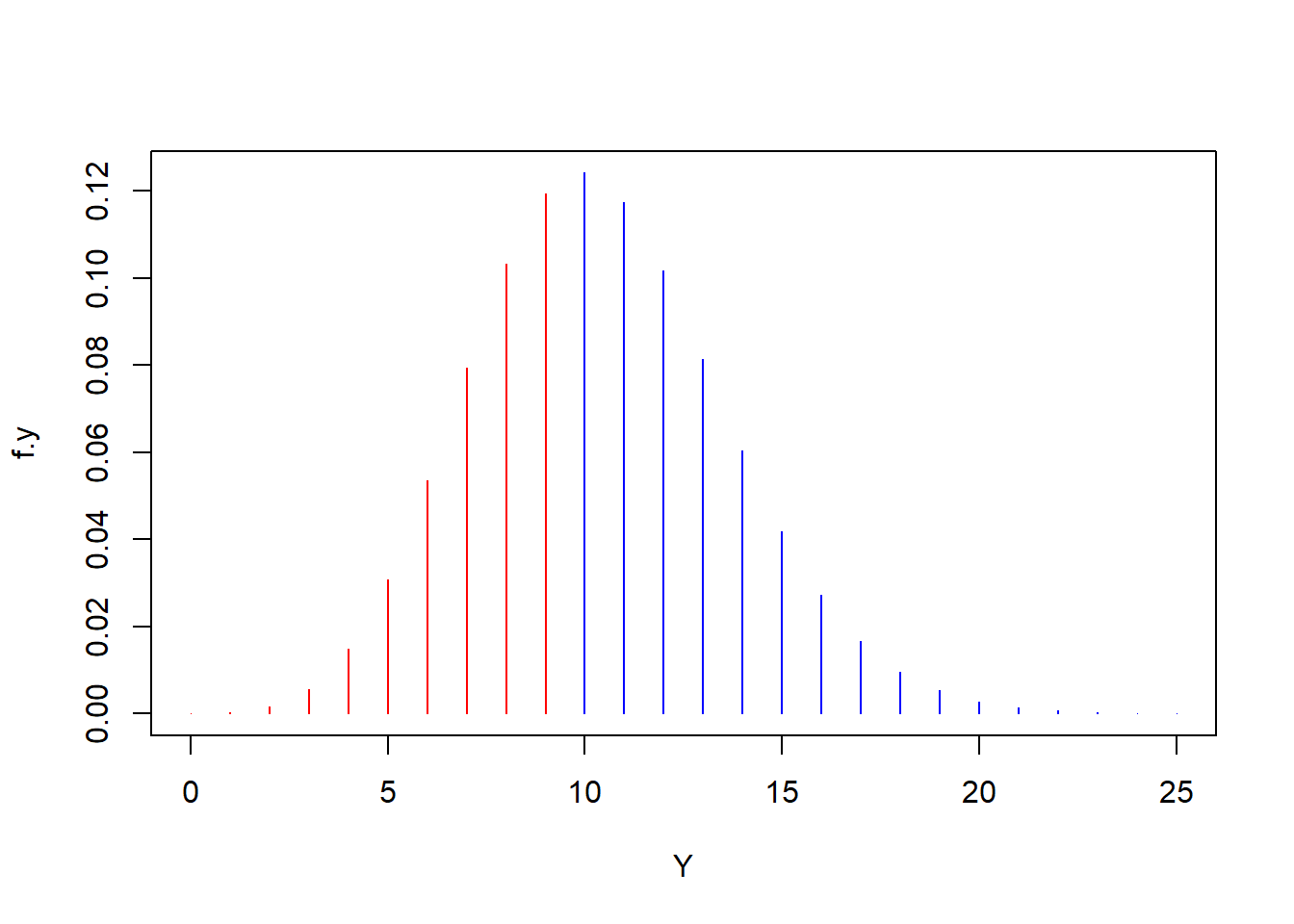 r Y <- 0:25 f.y <- dpois(x=Y,lambda=10.4) plot(f.y ~ Y, type="h",col=c(rep("red",10),rep("blue",16))) |