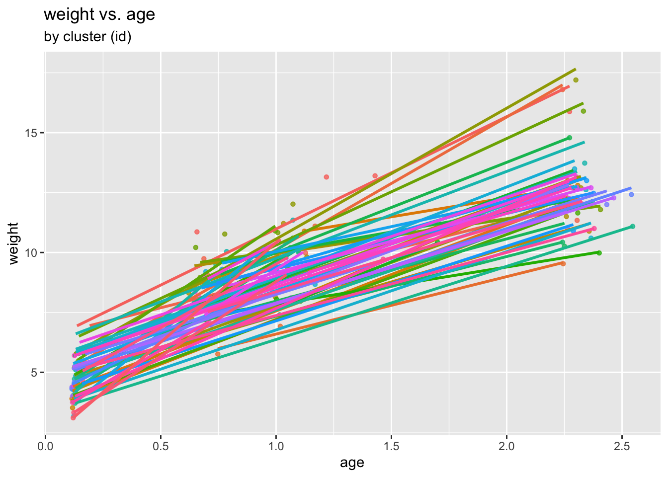 labs(title = "weight vs. age", subtitle = "by cluster (id)")