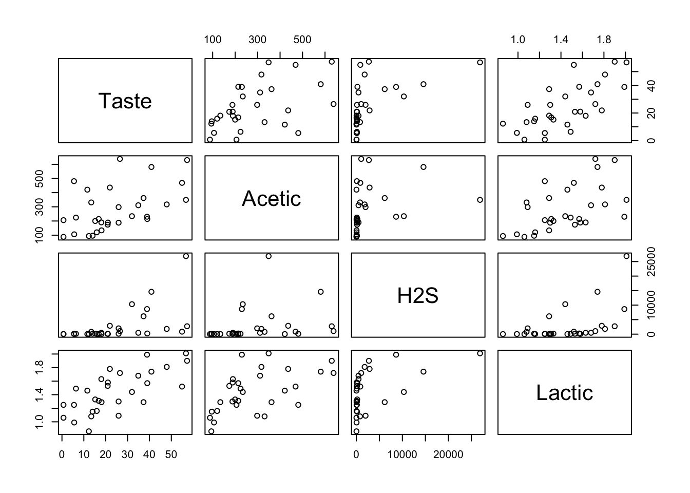 From the plot, it seems Lactic could have some good linear correlation with Taste.